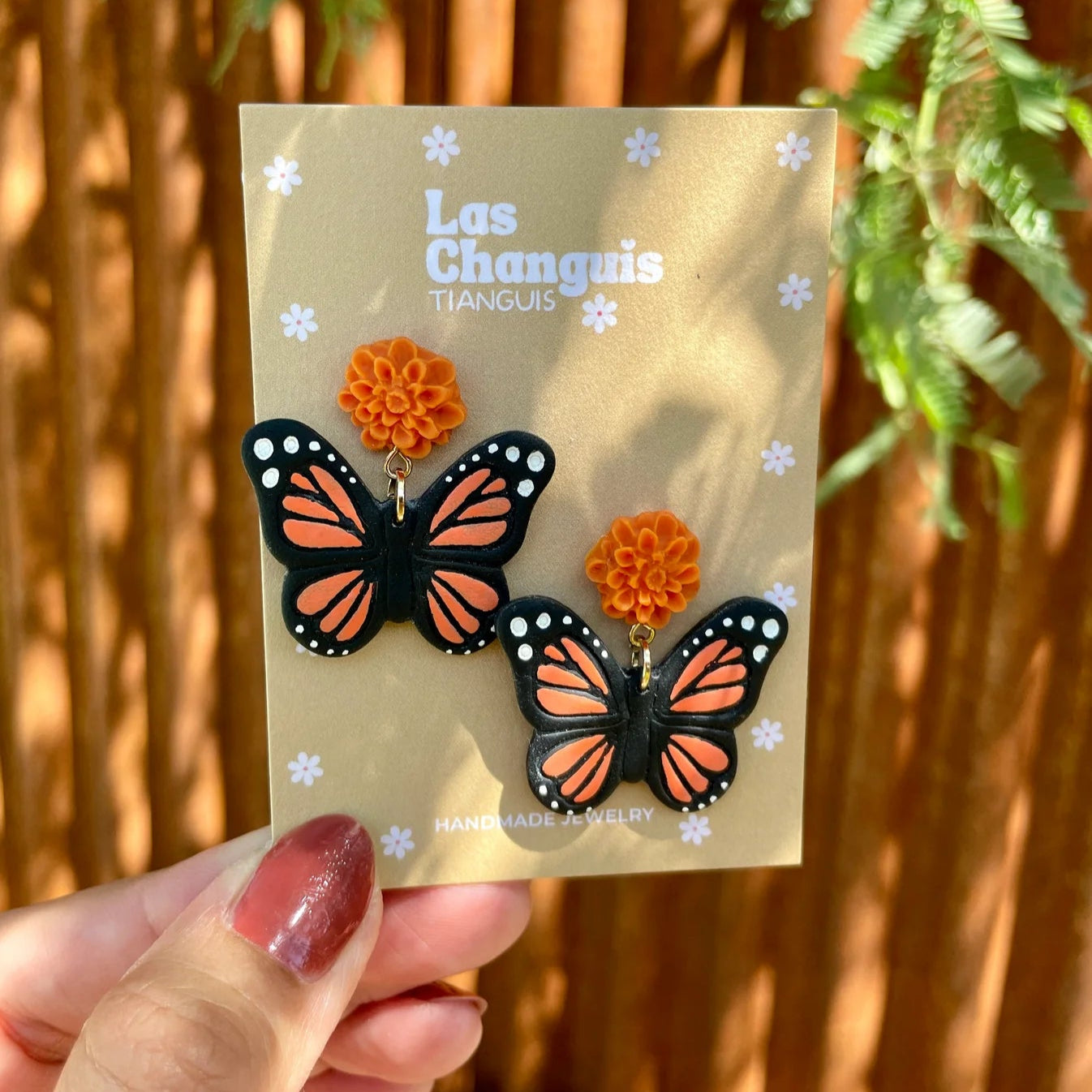 Handmade Monarch Butterfly Earrings with Cempasuchil Flowers - Day of the Dead Collection - Dia de los Muertos Jewelry
