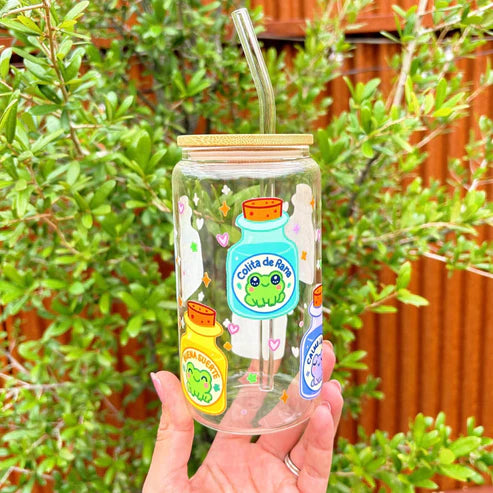 Sacred Heart Design with Love & Amor | 16 oz Glass Cup with Bamboo Lid & Straw