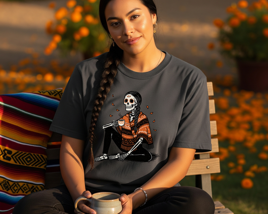 Día de Muertos Skeleton Mujer Comfort Colors® T-Shirt – Cozy Fall Tee with Cafecito & Marigold Petals