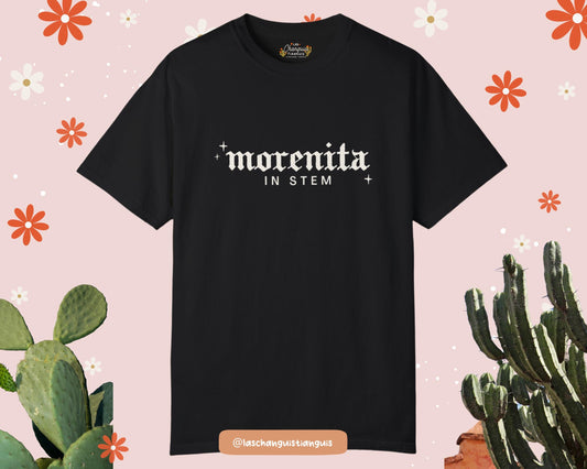 Morenita in STEM Shirt – Chicana Latina Women in STEM Tee – Gothic Old English Font – Empowering STEM Gift for Mujeres Científicas