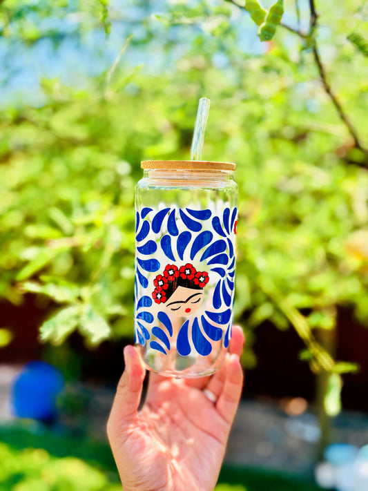 Frida-Inspired Glass Cup – Talavera Blue | 16oz Libbey Can Glass with Bamboo Lid & Glass Straw
