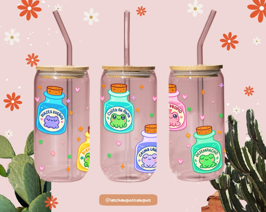 Frog Elixir Libbey Glass Cup – Sana Sana Potion Collection | 16oz Tumbler with Bamboo Lid & Straw | Cute Latina Gift, Emotional Support Cup