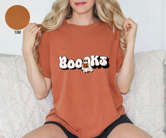 Unique Oversized Halloween Teacher Shirt: 70s Retro 'BOOKS' Design with Ghost Reading a Book - Spooky and Stylish!