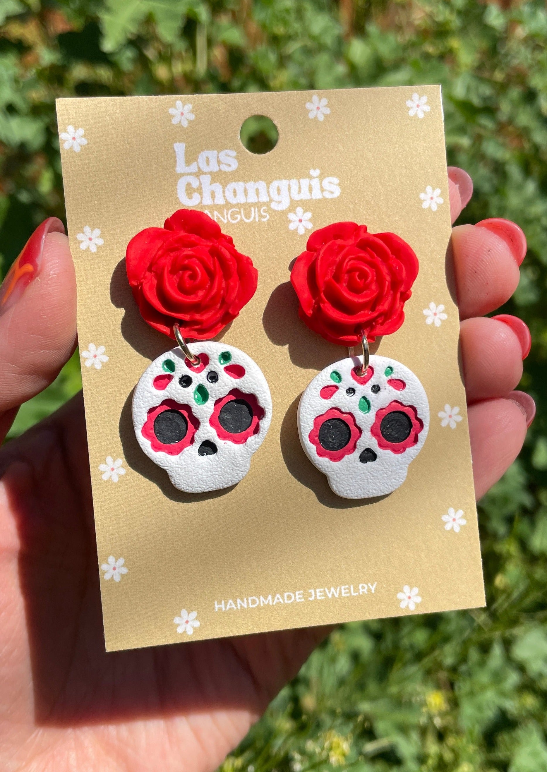 Embrace the vibrant spirit of tradition and craftsmanship with our Handmade Catrina Polymer Clay Earrings. Each pair is a testament to the beauty of artisanal skill, molded from premium polymer clay and brought to life with delicately handpainted acrylics. Dangling gracefully, these earrings feature a little Catrina, adorned with a meticulously crafted rose atop her head, symbolizing the rich culture and festive essence of Dia de los Muertos.