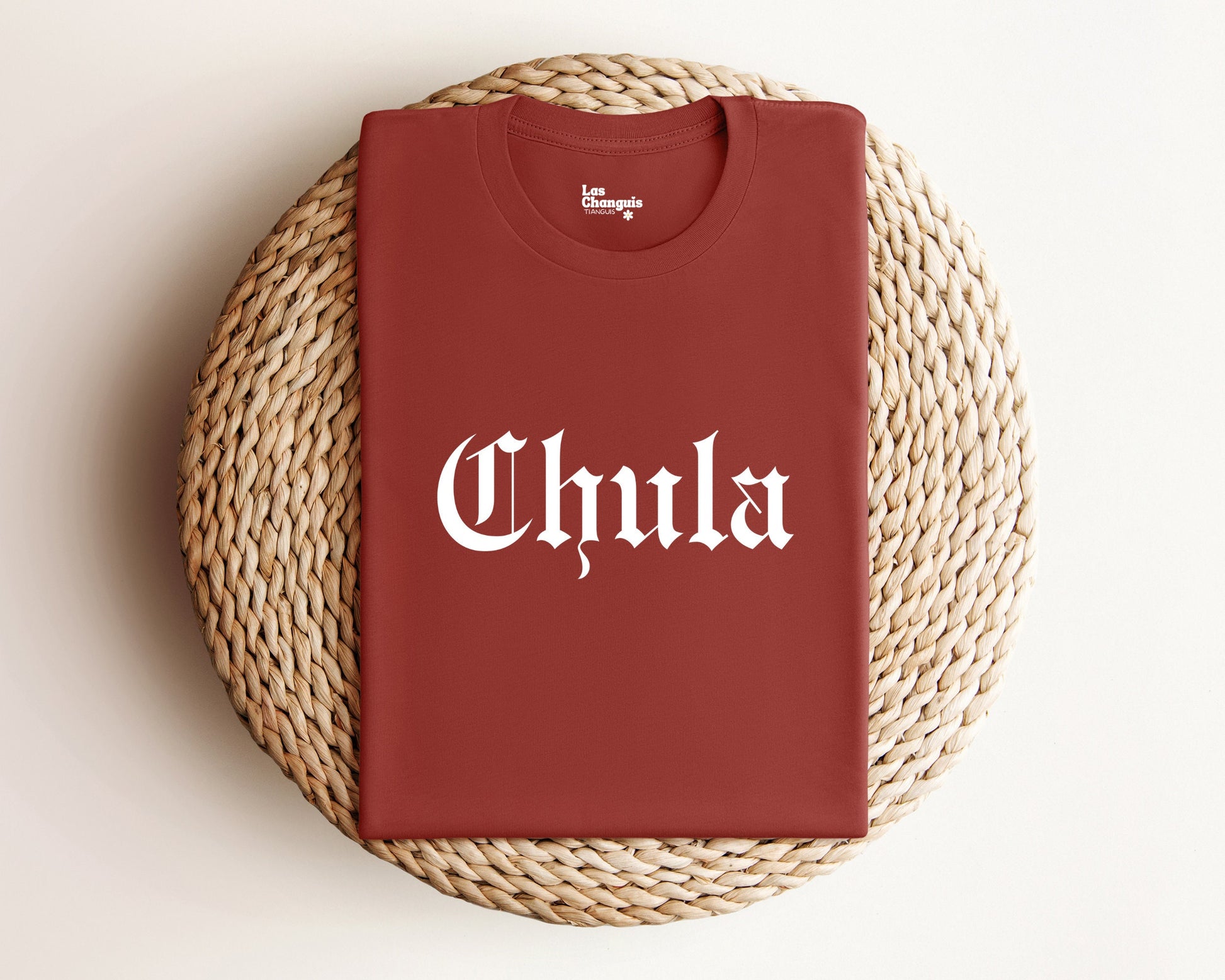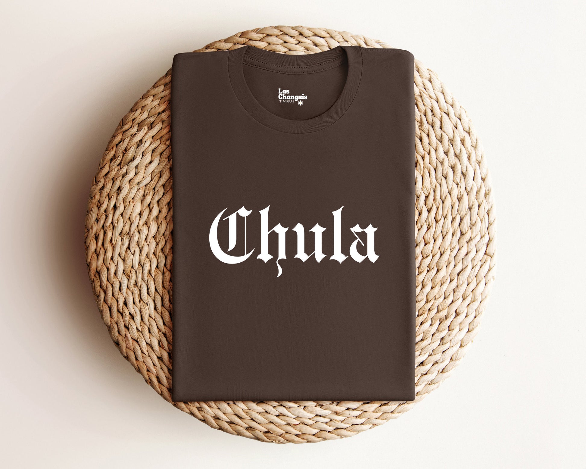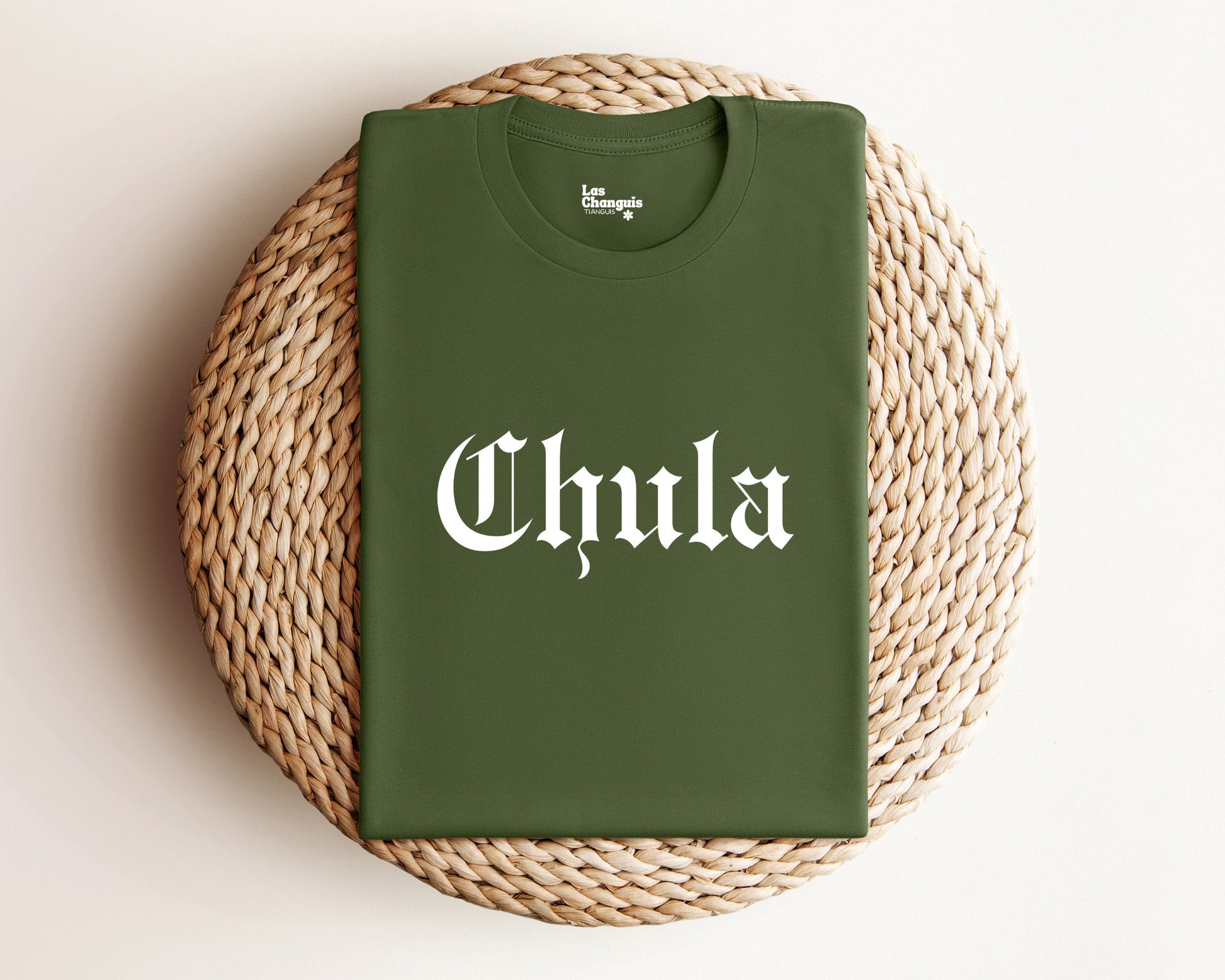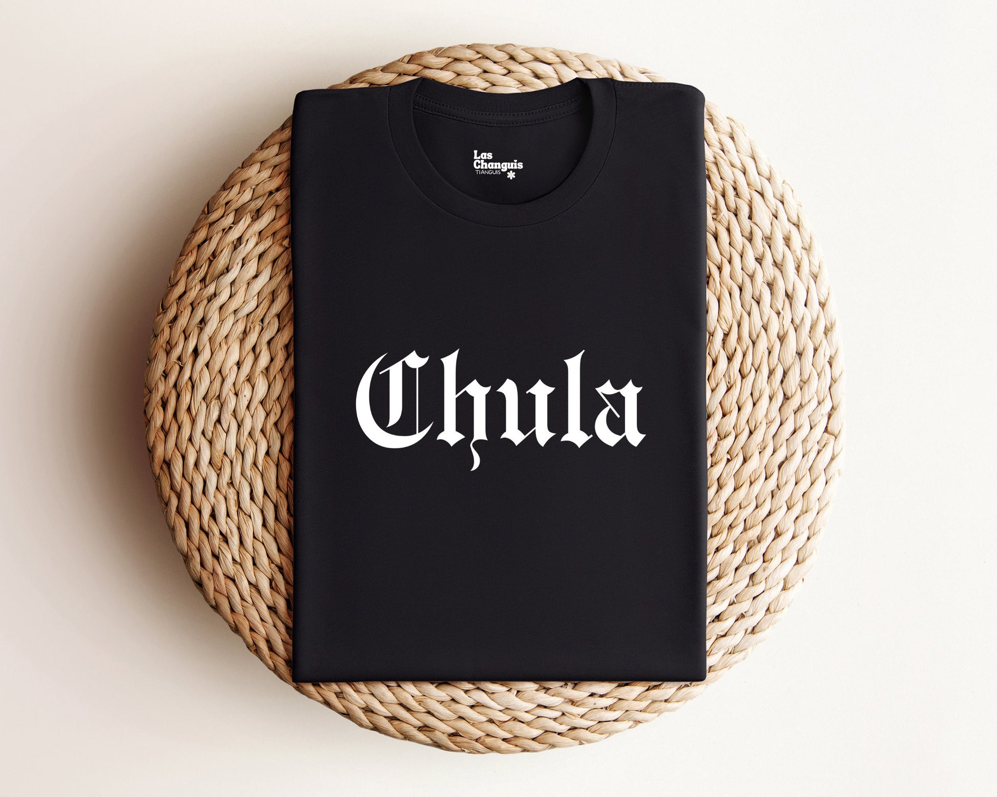 **1. "Chula" in Old English:** This tee showcases the word "Chula" in a captivating Old English font. It's a testament to your individuality, and it radiates confidence and strength with every wear.
