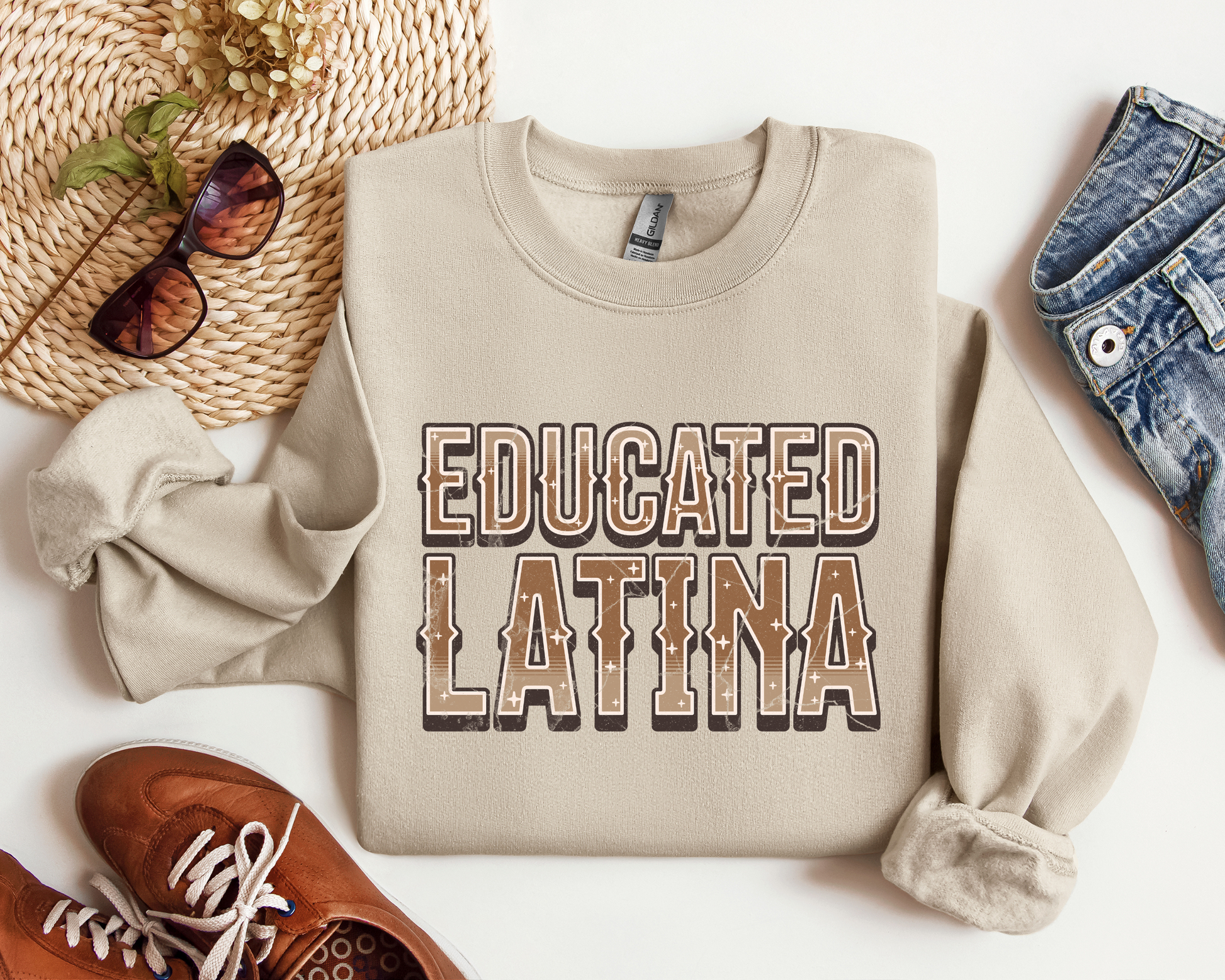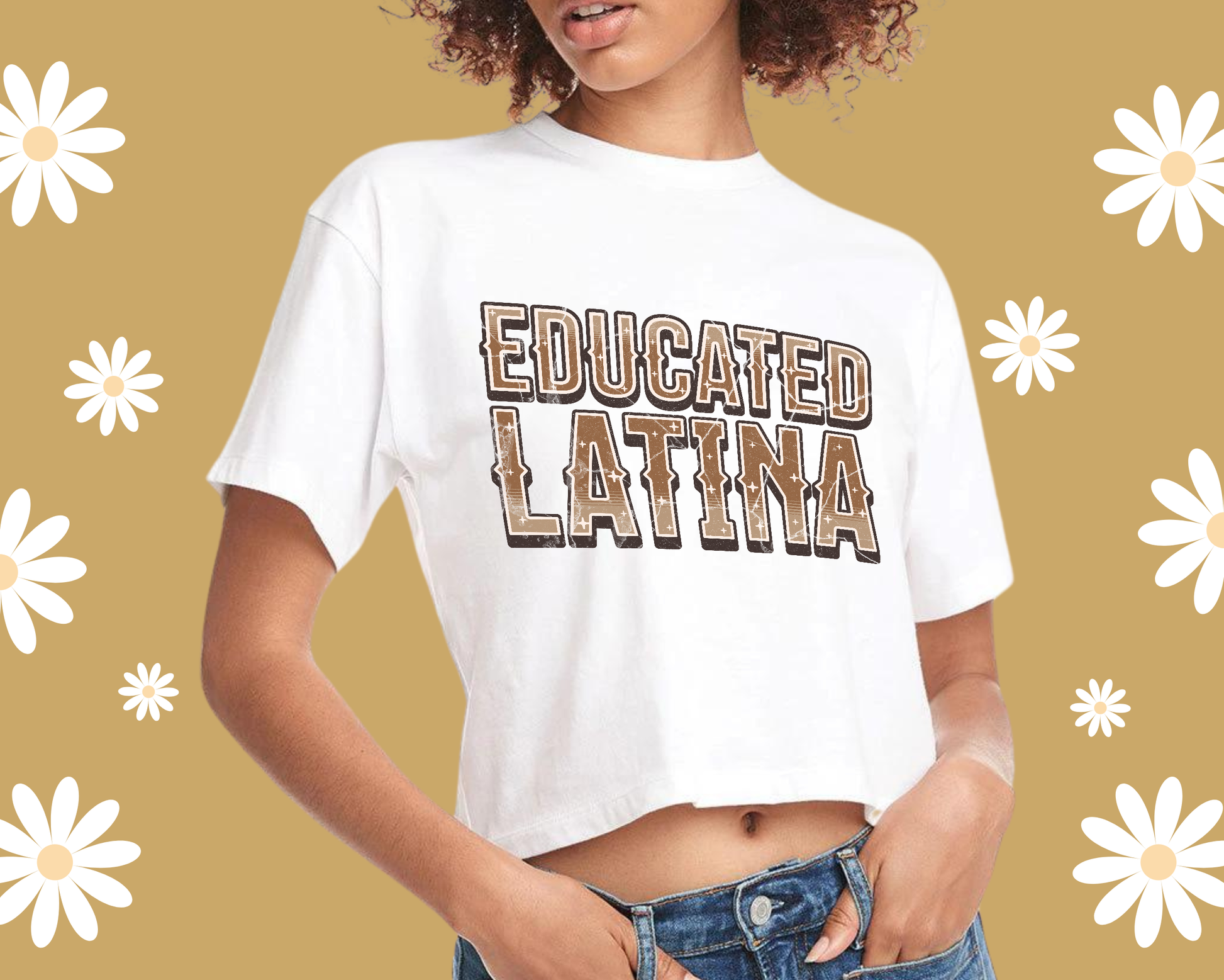 Celebrate the strength and achievements of Latinas with our "Educated Latina" t-shirt, featuring bold western lettering inspired by the Sonoran Desert. This design symbolizes resilience, culture, and the pursuit of education. Choose from a range of styles—comfortable unisex tee, stylish cropped top, or warm crewneck—to show off your pride and inspiration. Perfect for daily wear, academic events, or as a gift to empower the educated Latina in your life. Wear your roots and your achievements with pride!