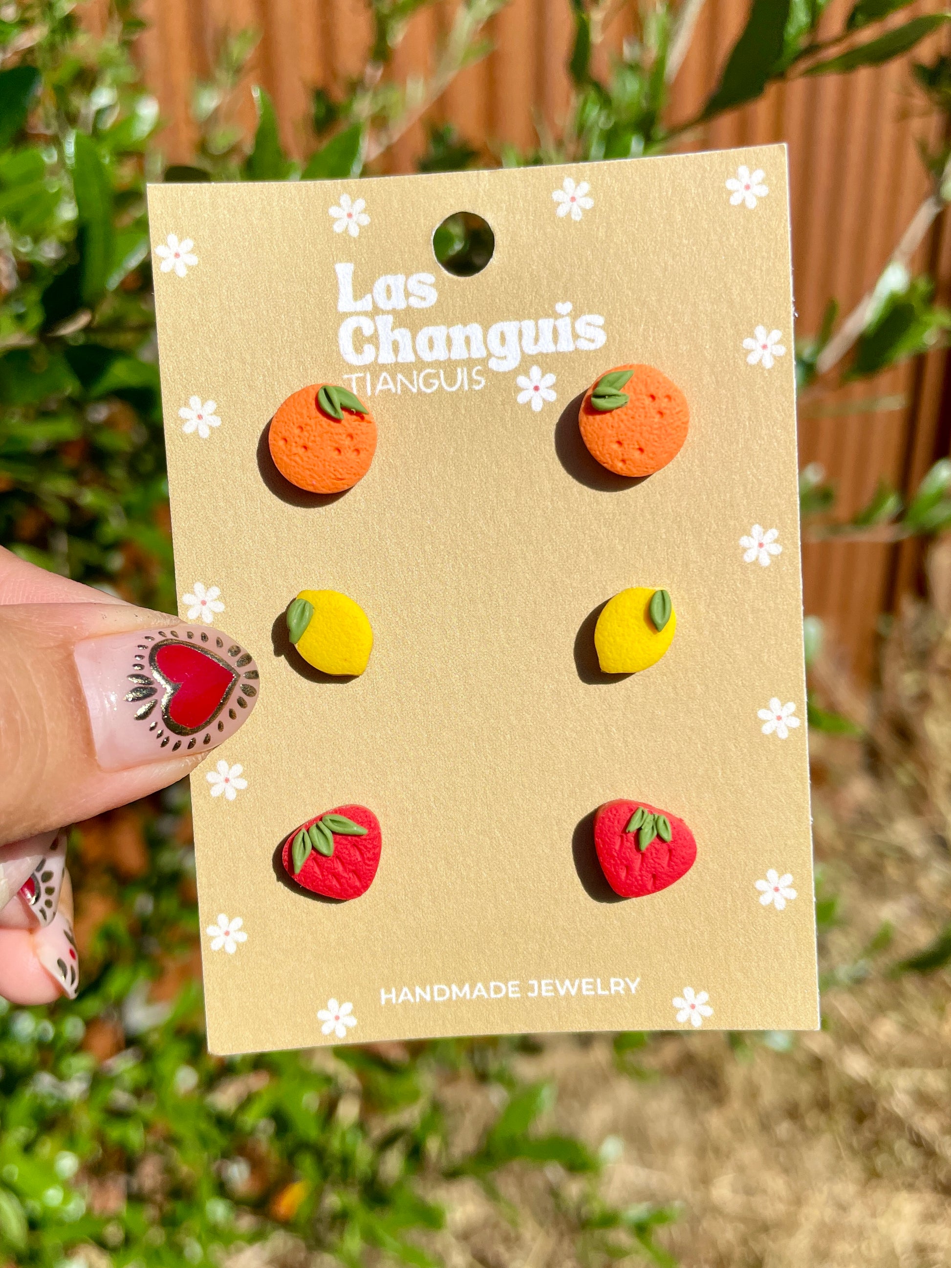 Brighten up your everyday look with our Fruit Micro Stud Pack, featuring adorable tiny oranges, lemons, and strawberries. Each pair in this delightful trio is carefully crafted from polymer clay to capture the essence of these vibrant fruits in miniature form. Perfect for mixing and matching or wearing as standalone pieces, these studs are versatile and full of charm. The nickel-free posts ensure they are comfortable for all-day wear, making them a sweet addition to any jewelry collection. Ideal for fruit lovers and those who adore playful, minimalistic accessories.