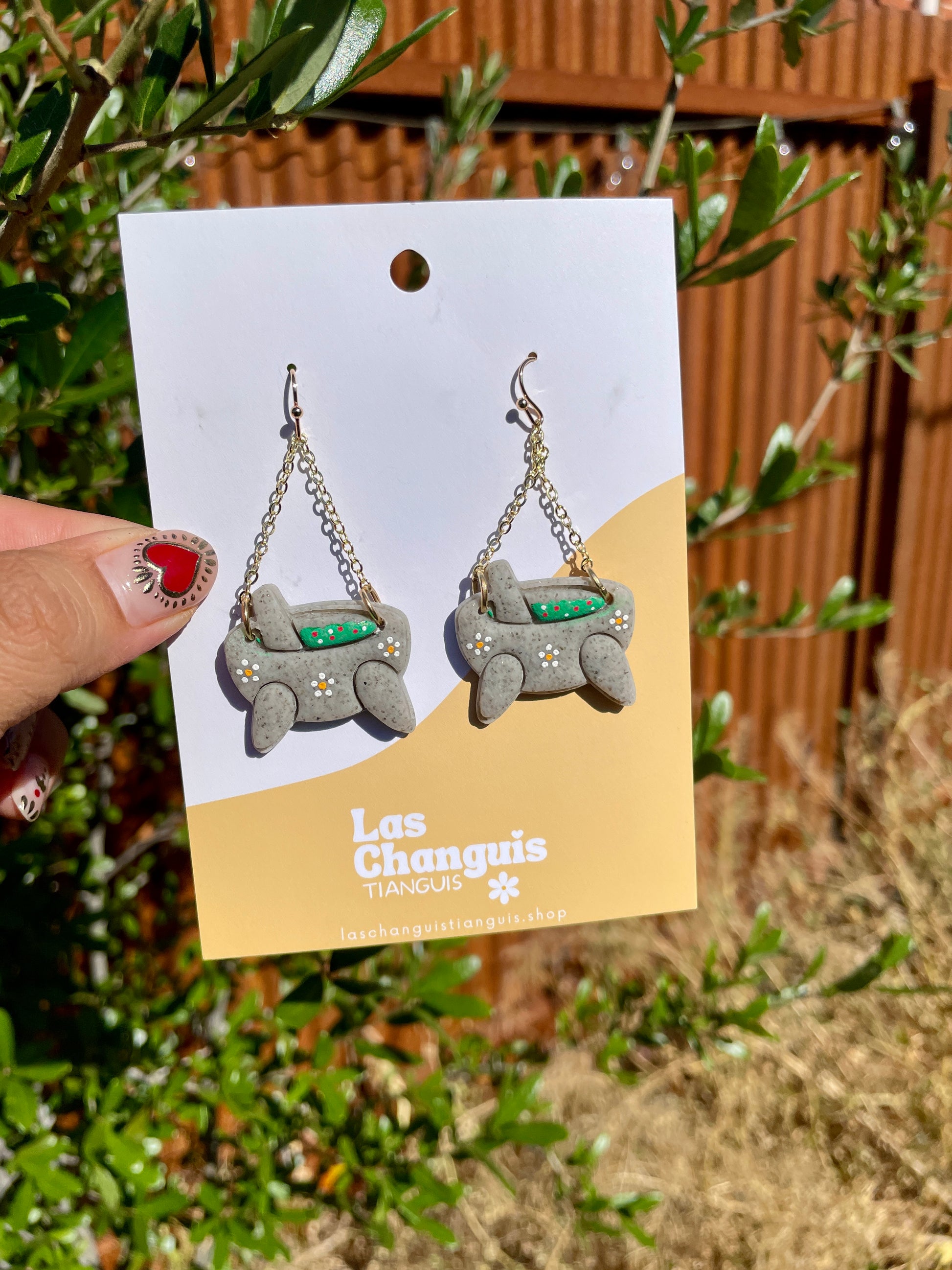Celebrate the flavors of Mexico with our handcrafted Molcajete Dangles earrings. Inspired by the traditional Mexican molcajete used for making salsas and guacamole, these earrings feature a detailed polymer clay molcajete filled with vibrant, textured guacamole, and adorned with delicately handpainted flowers. Perfect for culinary enthusiasts and those who appreciate artisan craftsmanship, these earrings bring a touch of Mexican cuisine to your style. Equipped with nickel-free hooks, they provide comfort for all-day wear, making them a delightful addition to any jewelry collection.