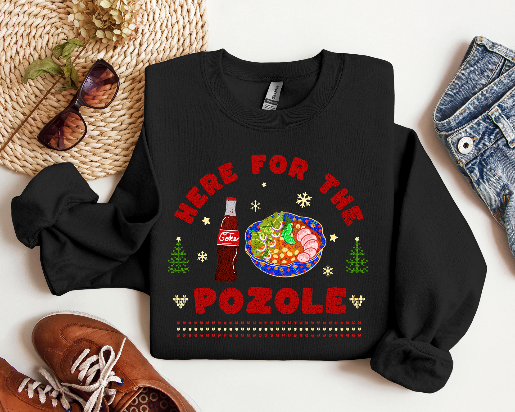 Get ready for the ultimate holiday celebration with this festive "Here for the Pozole" Christmas sweater! Perfect for cozy gatherings with family and friends, this exclusive black crewneck is a must-have for every pozole lover. Featuring a colorful, mouthwatering bowl of pozole and a classic bottle of Coke, this sweater celebrates the cherished traditions of Latino households during the holidays.