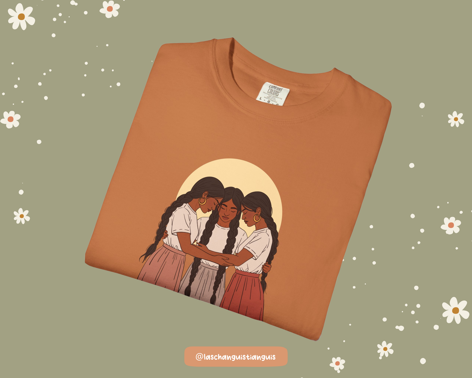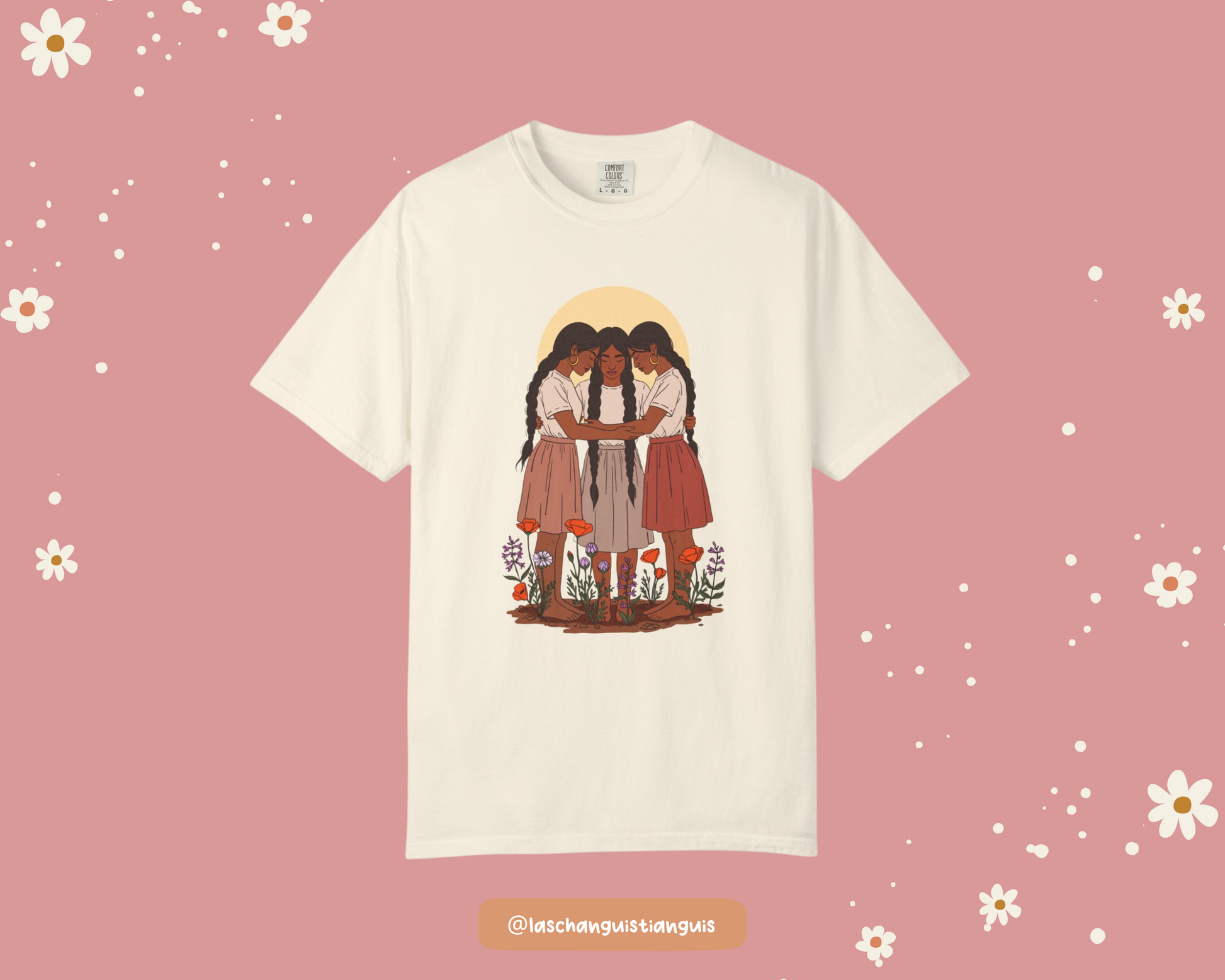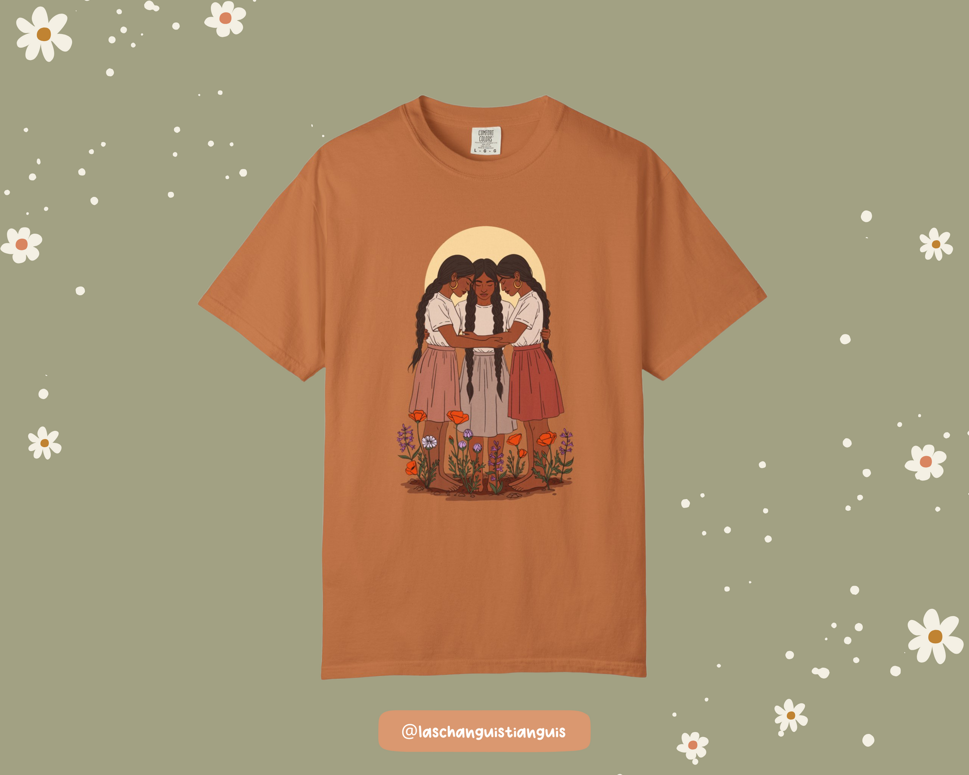 Wrap yourself in the beauty of sisterhood and heritage with our "Hermanas" tee. Featuring a stunning original illustration by Las Changuis Tianguis of three figures with braided hair, rooted in the earth and surrounded by blooming poppies, this shirt is a powerful symbol of community, strength, and connection to the land.
