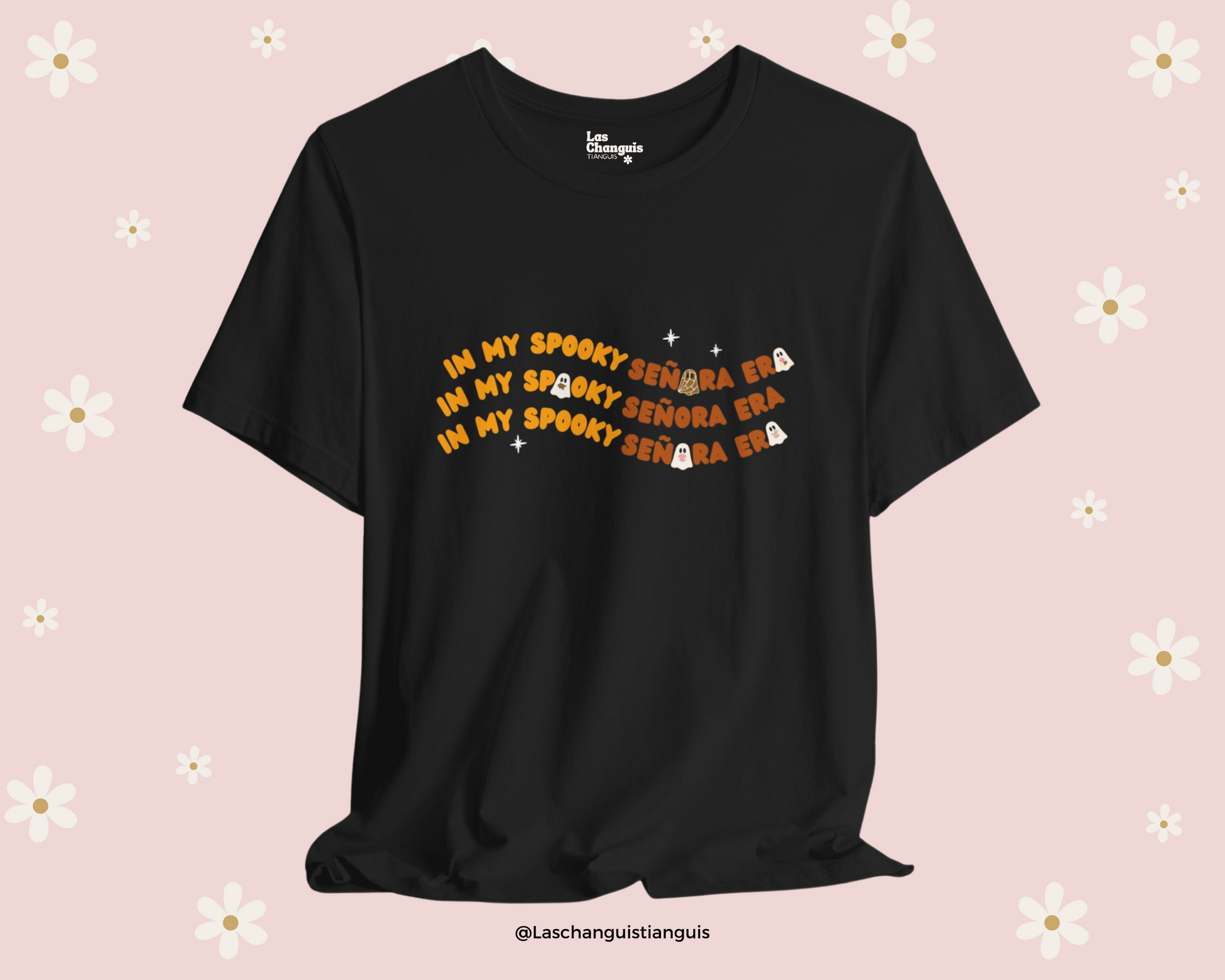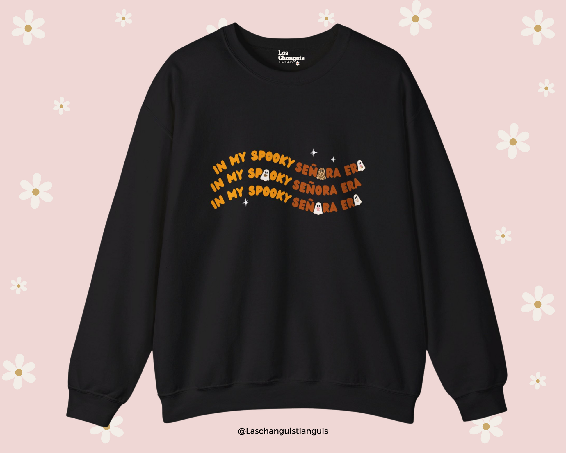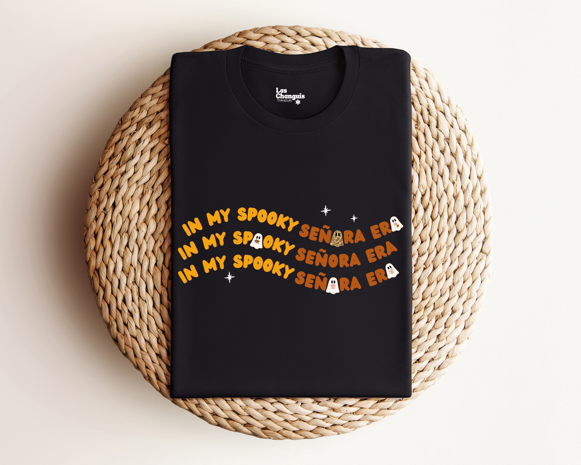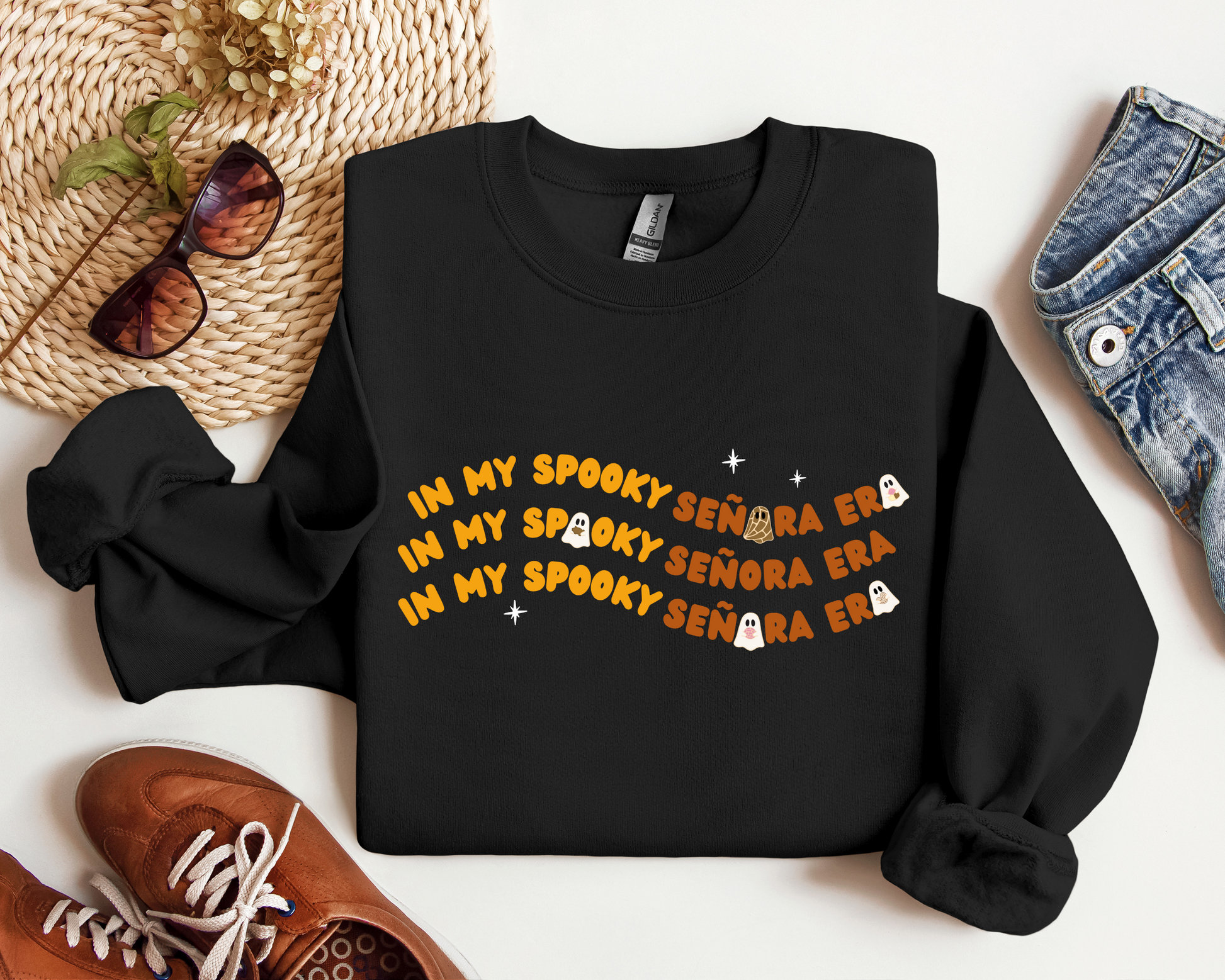 Celebrate the spooky season with a cultural twist in our 'In My Spooky Señora Era' design, available as both a unisex tee and a cozy crewneck! Featuring charming ghosts holding pan dulce, including conchitas, in warm, autumn colors, this apparel is perfect for Latinas embracing the fun of Halloween. Whether you're at a festive gathering or enjoying a quiet night, this shirt or crewneck offers both comfort and style. Choose the fit that best suits your vibe and make this Halloween extra special.