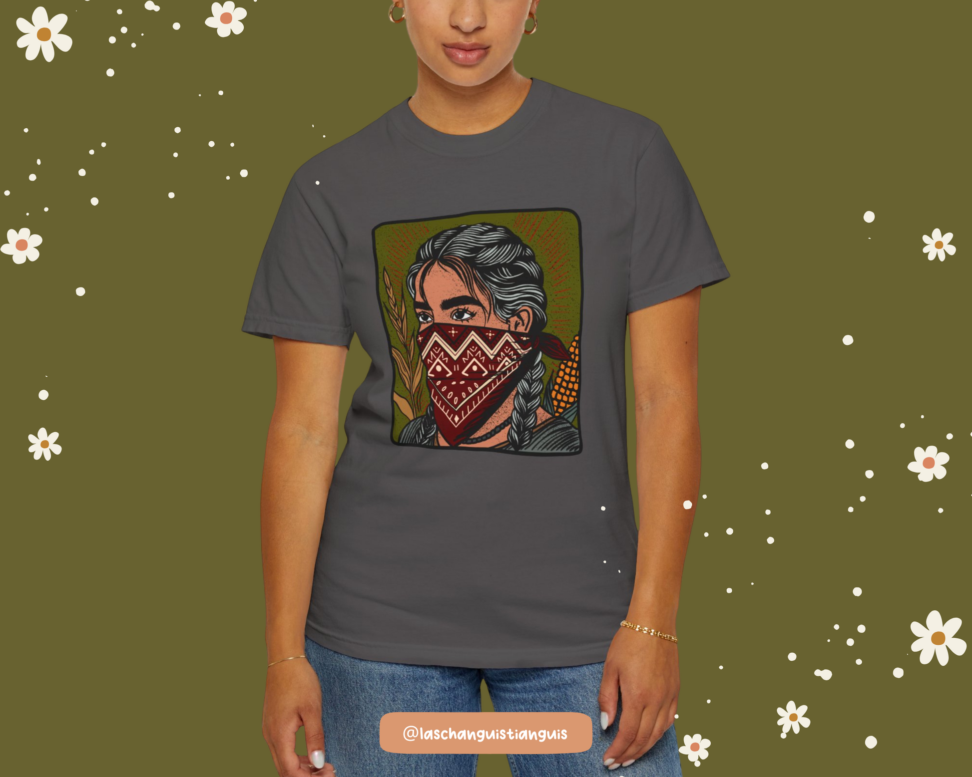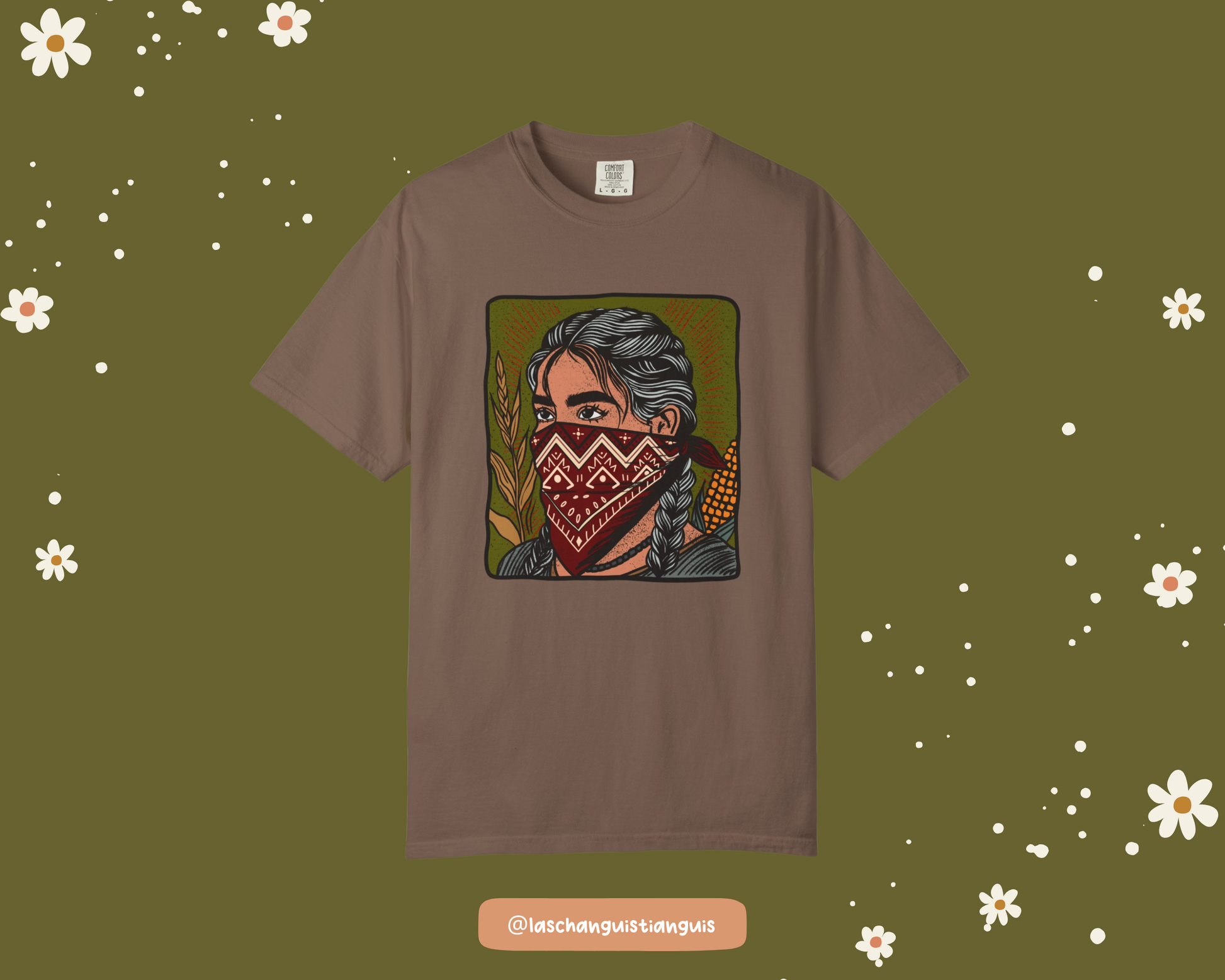 For the mujeres who carry land, memory, and resistance braided into their hair. Her bandana is not just for show — it’s survival, legacy, and quiet defiance. Surrounded by corn and wheat, she holds the line between what’s taken and what remains.