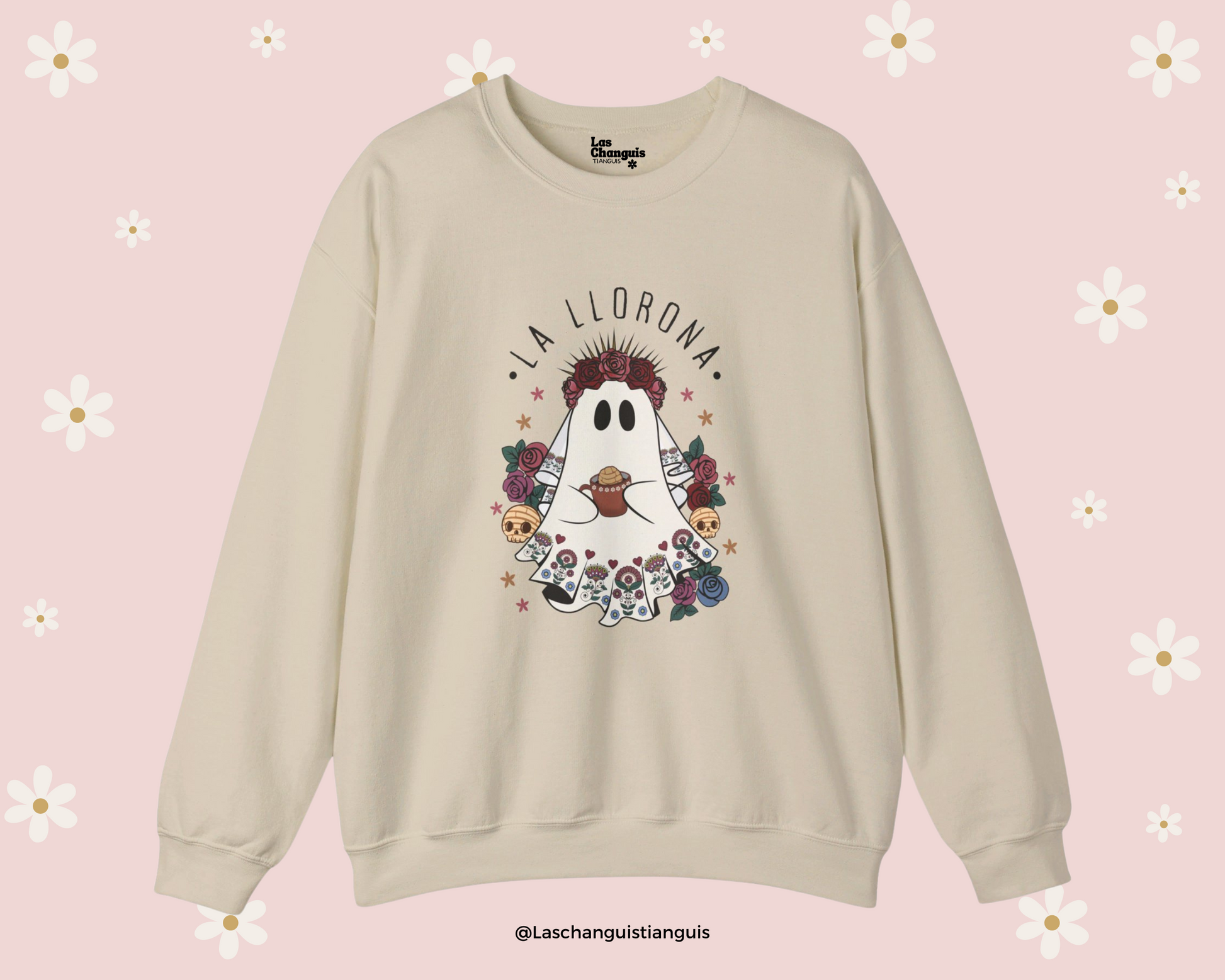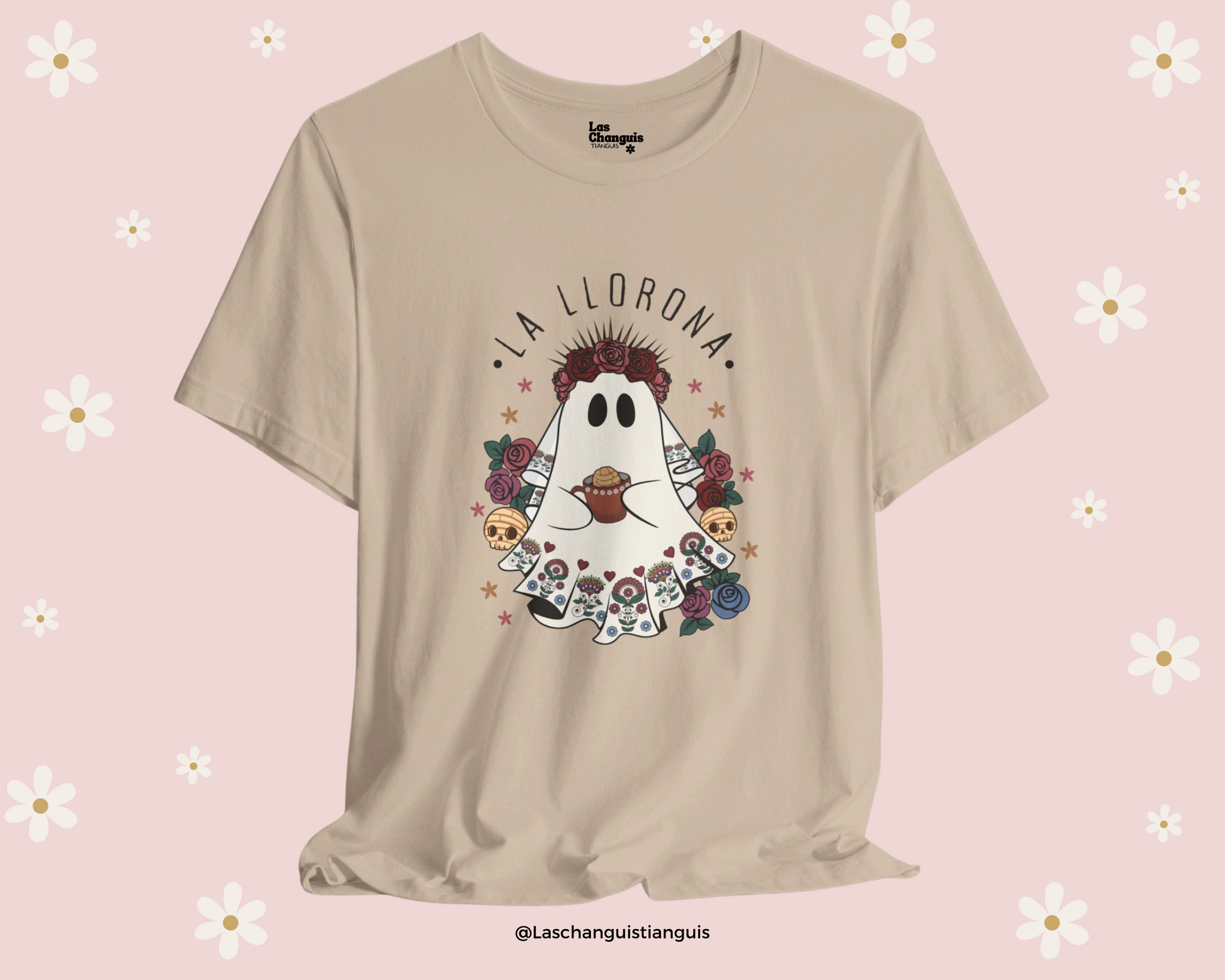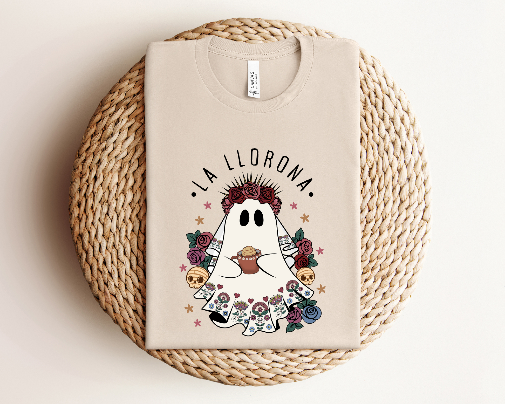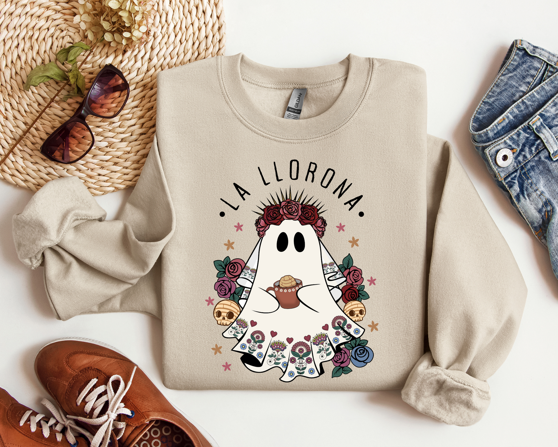 Embrace the mystical and cultural beauty of Día de los Muertos with our 'La Llorona Ghost' design. This unique design features a charming ghost adorned with a flower crown and spikes, wearing a beautifully embroidered dress and veil. Surrounded by flowers and conchita skulls, this ghost holds a warm cup of café de olla, bringing a touch of tradition and warmth to your Halloween or Día de los Muertos celebrations. Available in both a unisex tee and a cozy crewneck, this piece is perfect for anyone looking to celebrate in style with a nod to Mexican folklore.