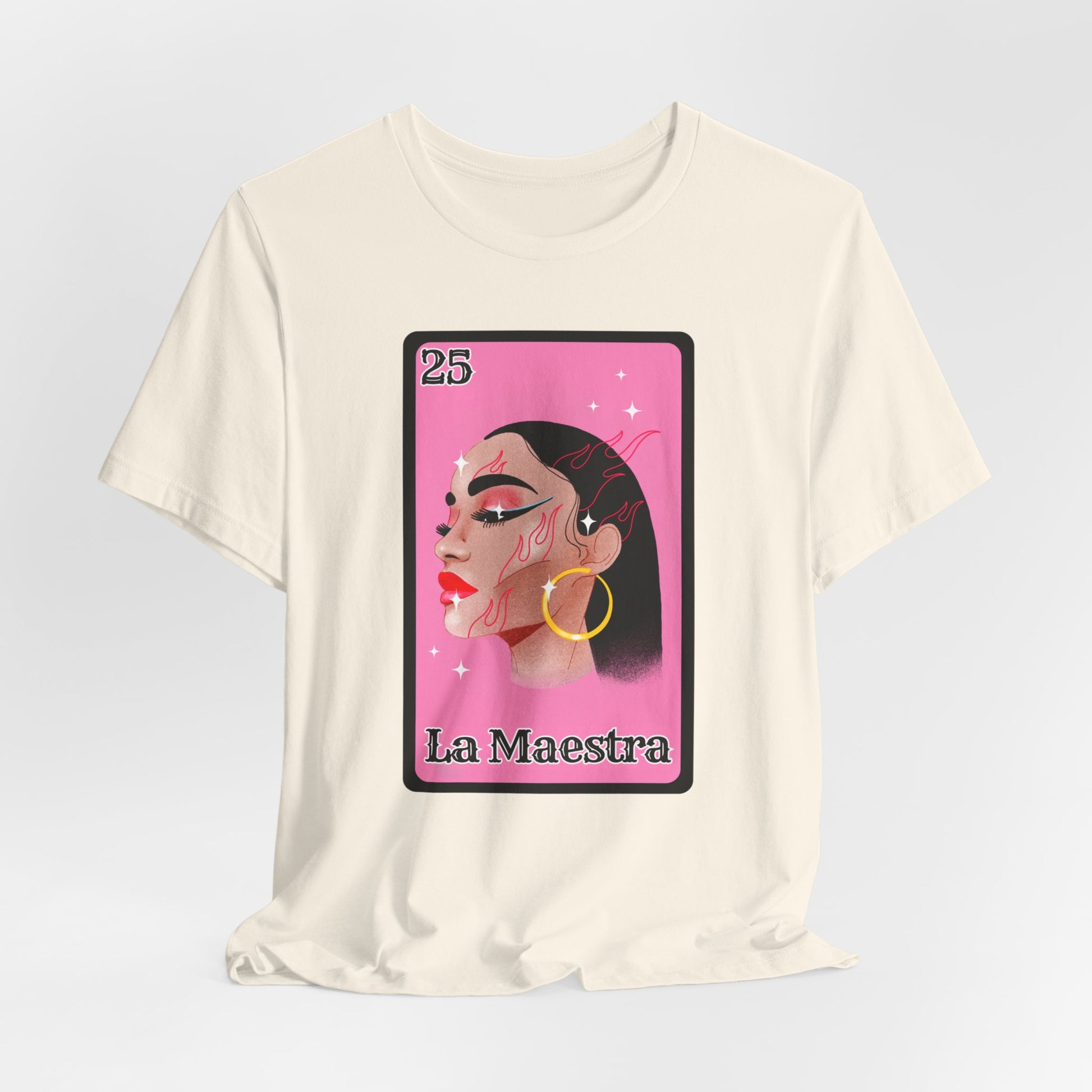 Celebrate the power and presence of Latina educators with our exclusive La Maestra Lotería-Inspired T-Shirt. This unique design pays homage to the traditional Lotería game, featuring the number 25 and a beautifully illustrated Latina woman, symbolizing "La Maestra" (The Teacher). Perfect for teachers, students, and Lotería enthusiasts, this shirt is more than just apparel—it's a statement of pride and cultural heritage.