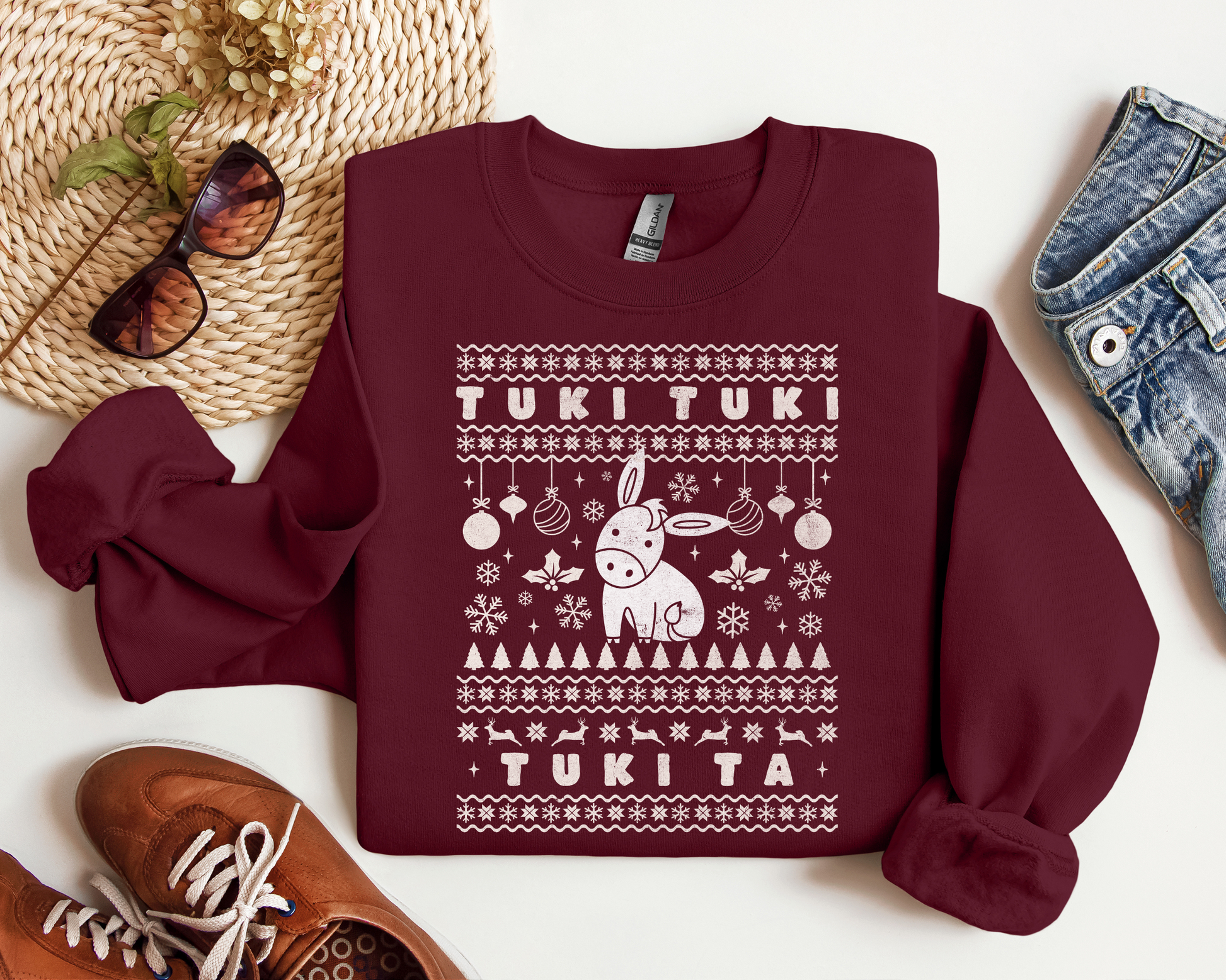 Celebrate the holiday season with a unique twist that honors one of the most beloved songs in the Latine community—"El Burrito Sabanero." Our "Tuki Tuki" ugly Christmas sweater combines festive vibes with a playful nod to the famous song lyrics. Featuring a cute, happy little donkey in the center and the iconic "tuki tuki tuki tuki" line from the song, this sweater is perfect for family gatherings, holiday parties, or just cozying up in festive style. Available in three rich holiday colors—maroon, red, and forest green—this sweater is soft, comfortable, and sure to spread joy and holiday cheer wherever you go. Whether you're singing along to the classic tune or just want a fun holiday sweater with a cultural flair, this is a must-have for your collection!