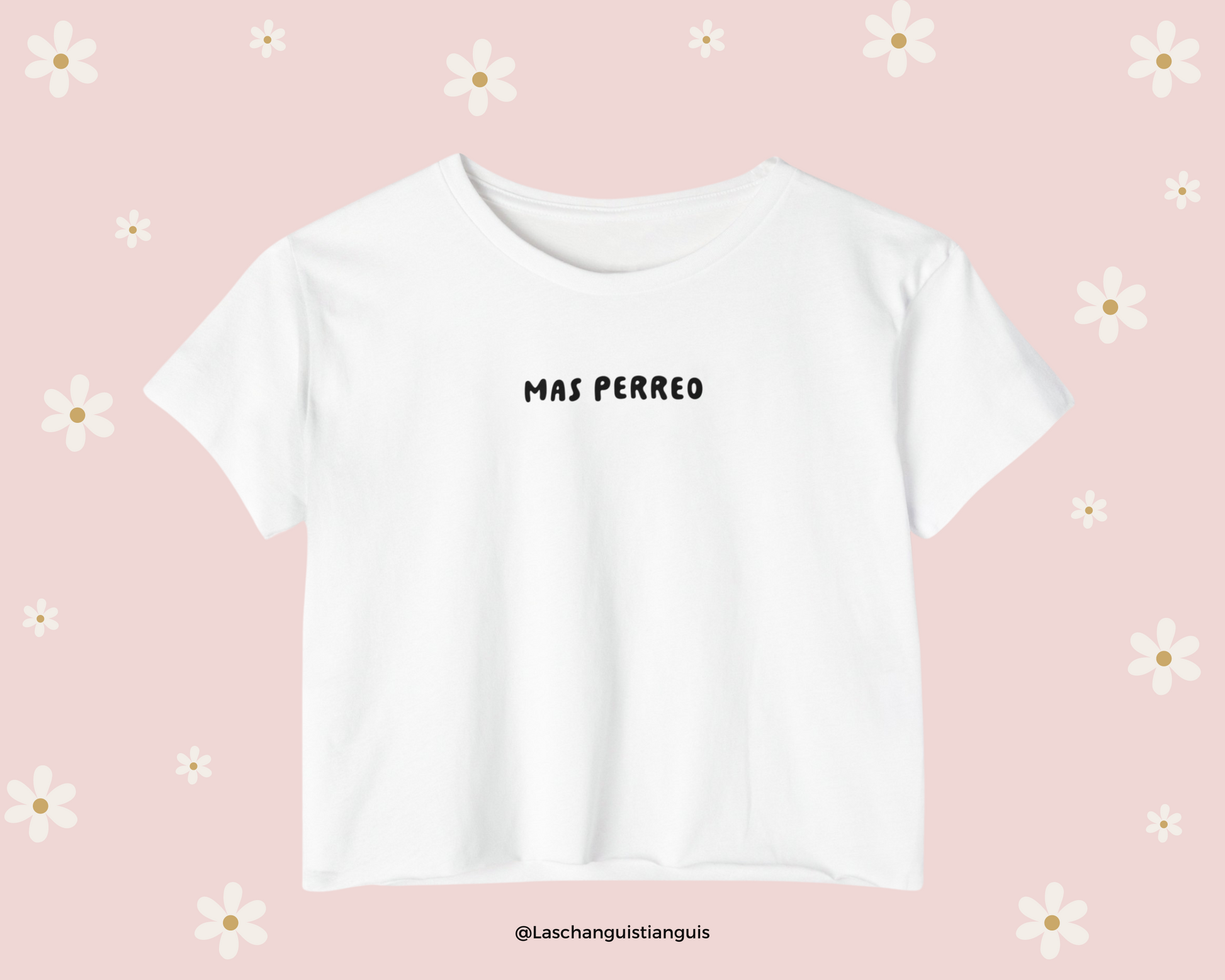 Heat up your summer wardrobe with our "Mas Perreo" Cropped Tee, designed especially for our fierce Latina queens! This stylish white cropped tee features "Mas Perreo" in a dainty, fun font that perfectly captures the spirit of summer parties and carefree dance nights. Made from soft, breathable fabric, this tee is perfect for keeping cool while turning up the heat on the dance floor. Pair it with your favorite high-waisted shorts or a flowy skirt, and get ready to shine all summer long. Embrace your rhythm and let your style do the talking with this must-have addition to your wardrobe.