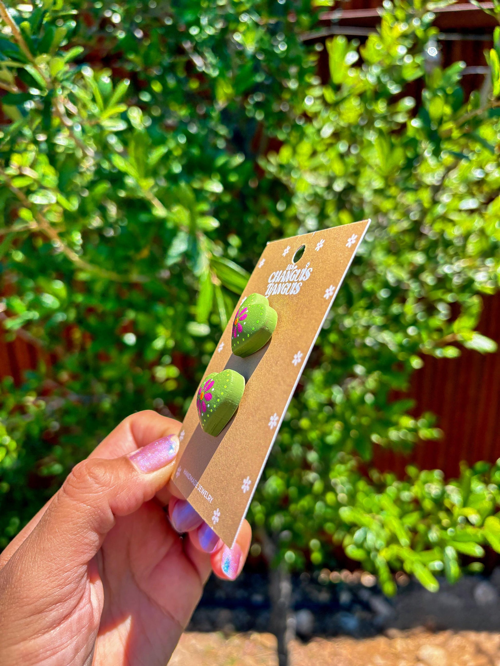 Inspired by traditional Mexican folk art and artesanías, these polymer clay earrings feature a sculpted heart in either bold Mexican pink or earthy cactus green, accented with a floral design and dotted borders.