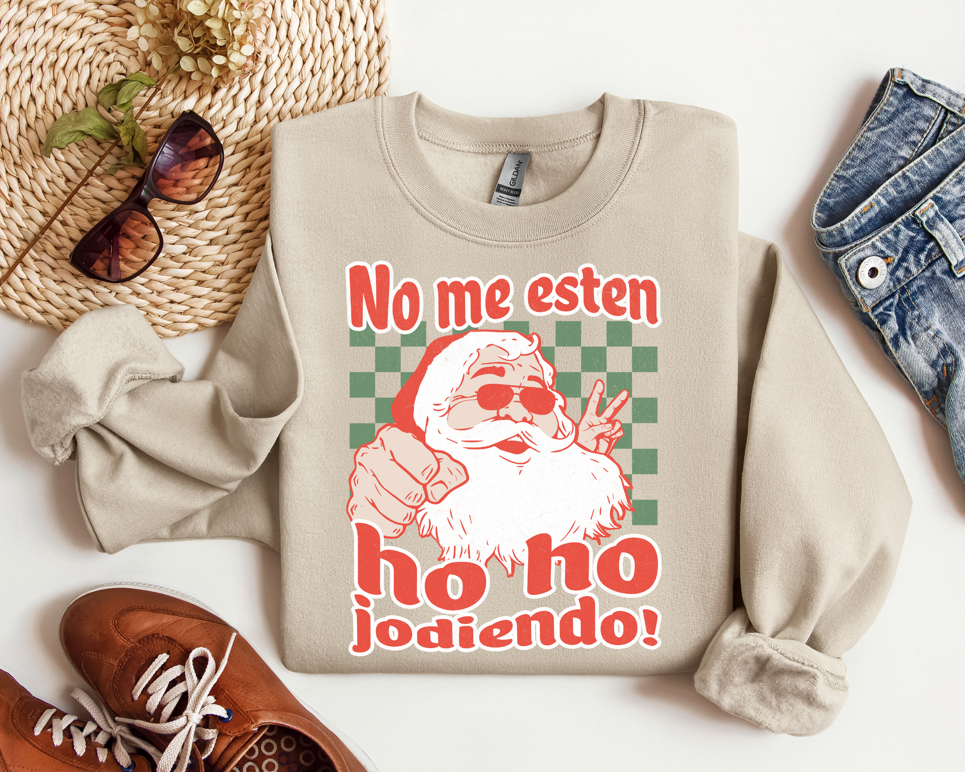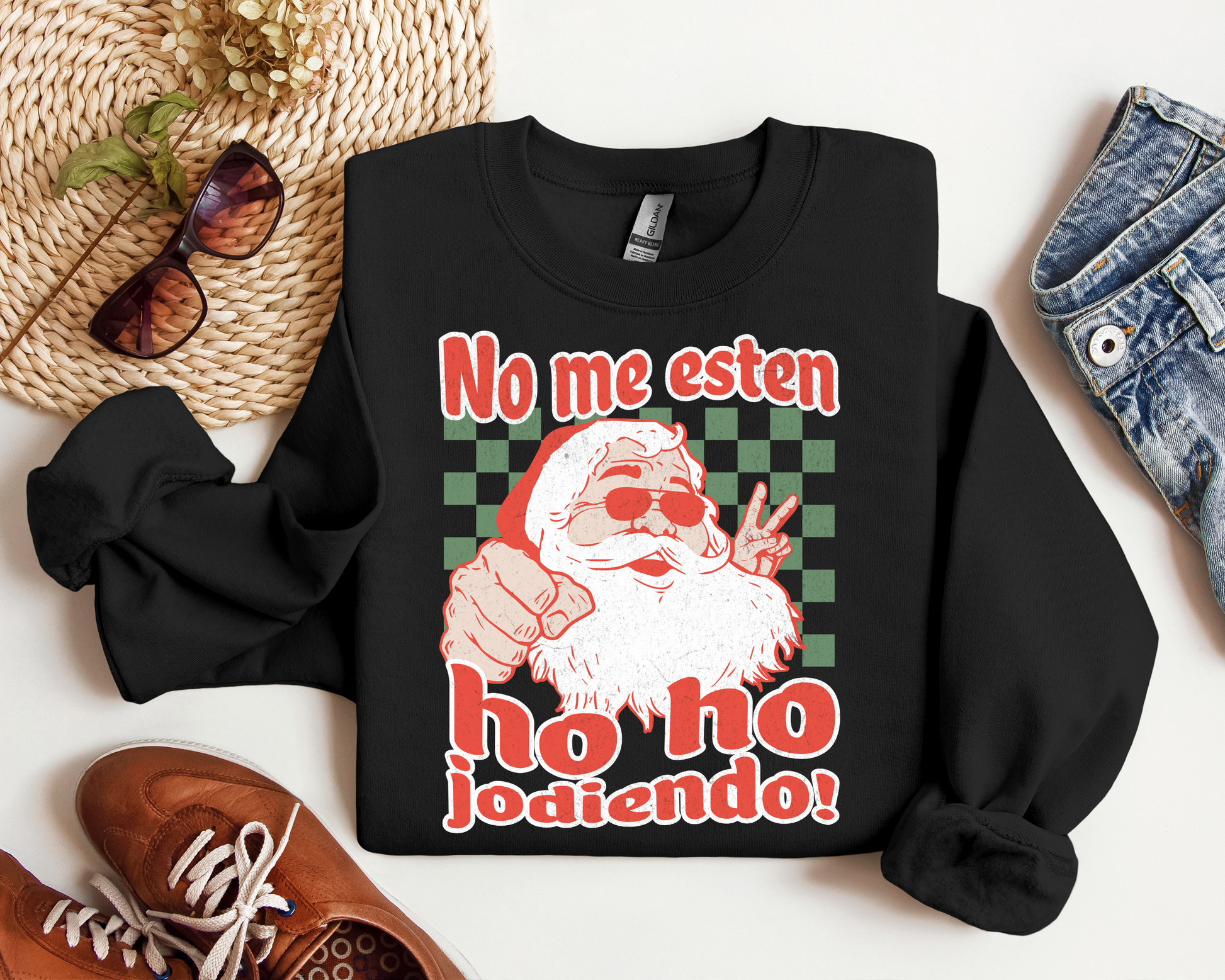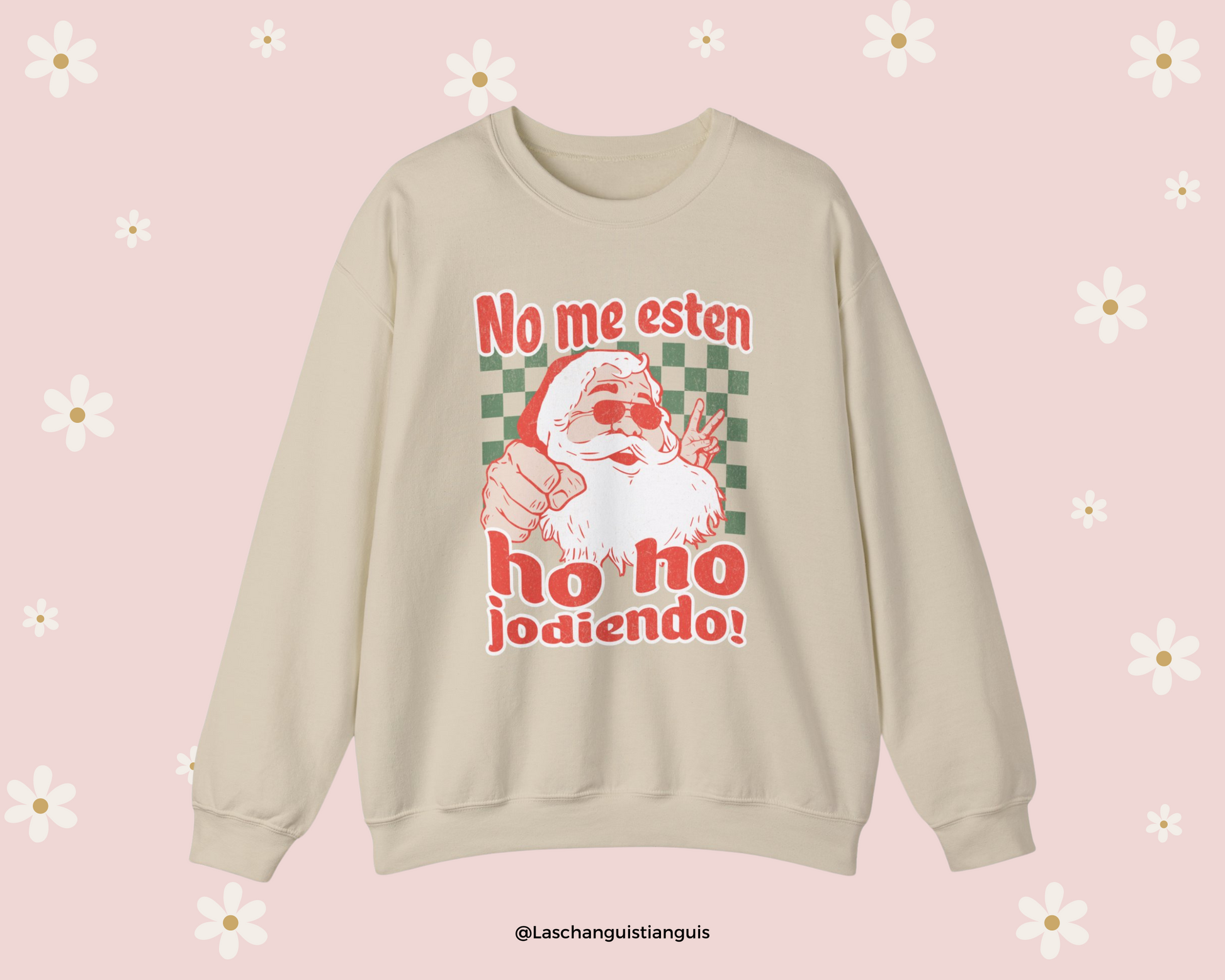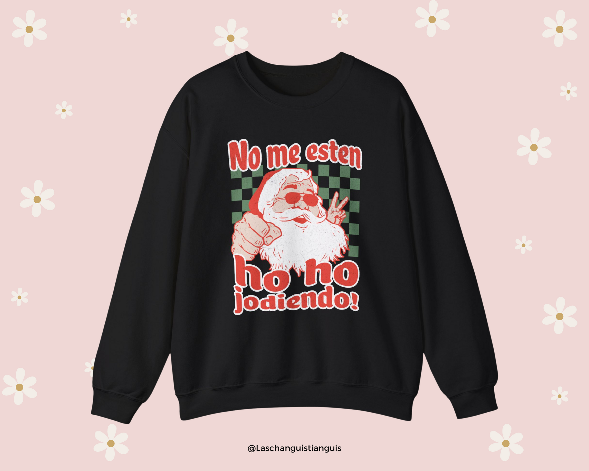 Bring some holiday humor to your wardrobe with this hilarious and bold Christmas sweater! Featuring a cool, hipster Santa rocking sunglasses and flashing a peace sign, this sweater humorously declares "No me esten ho ho jodiendo!" The design is completed with a retro, vintage look reminiscent of classic Christmas Coca-Cola commercials, with green checkered background details that give it a fun vibe. This sweater is perfect for anyone who loves a good laugh and wants to keep things festive but cheeky during the holiday season. Whether you're attending an ugly sweater party or just hanging out with friends and family, this is sure to be the talk of the party!.