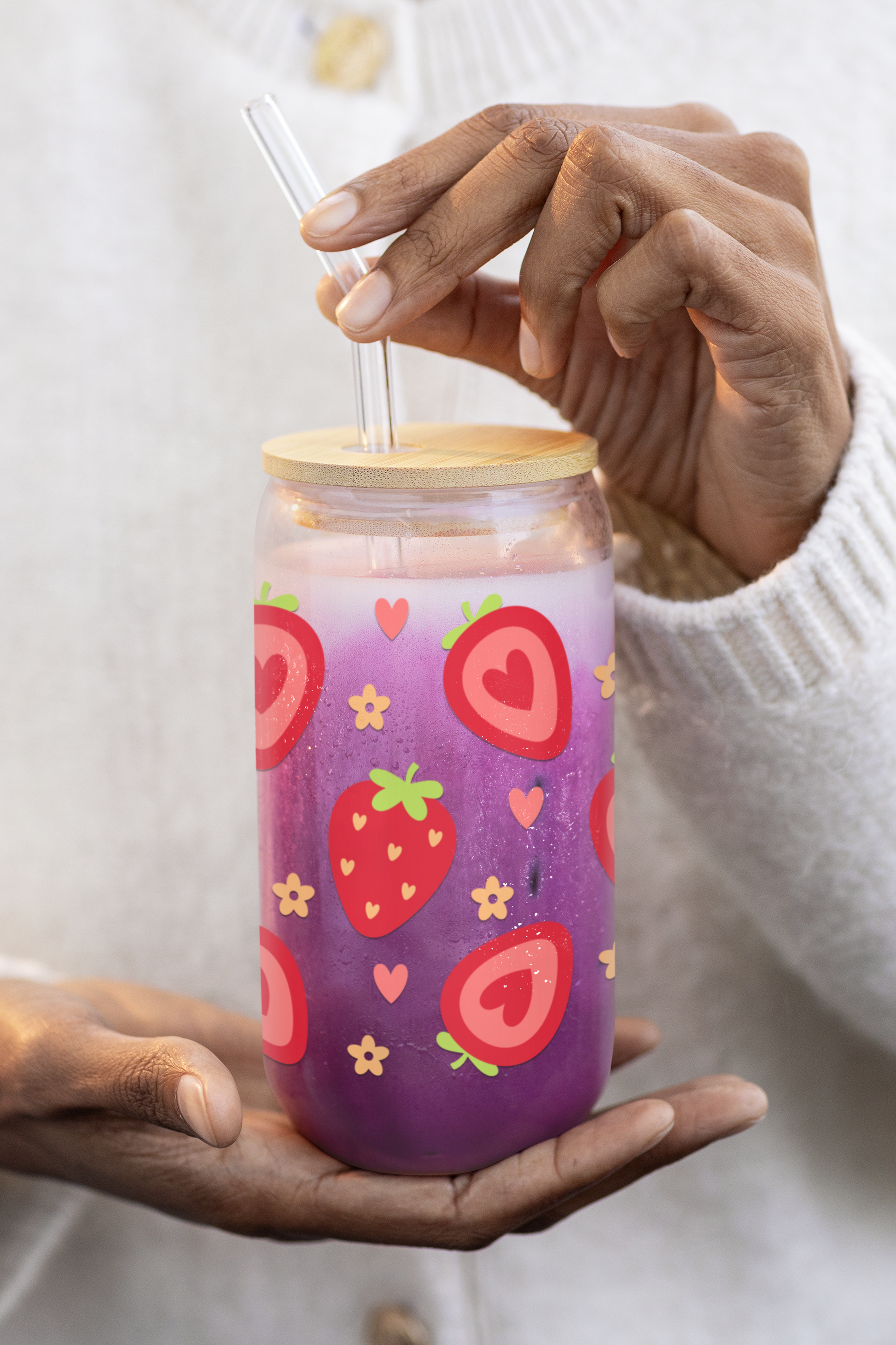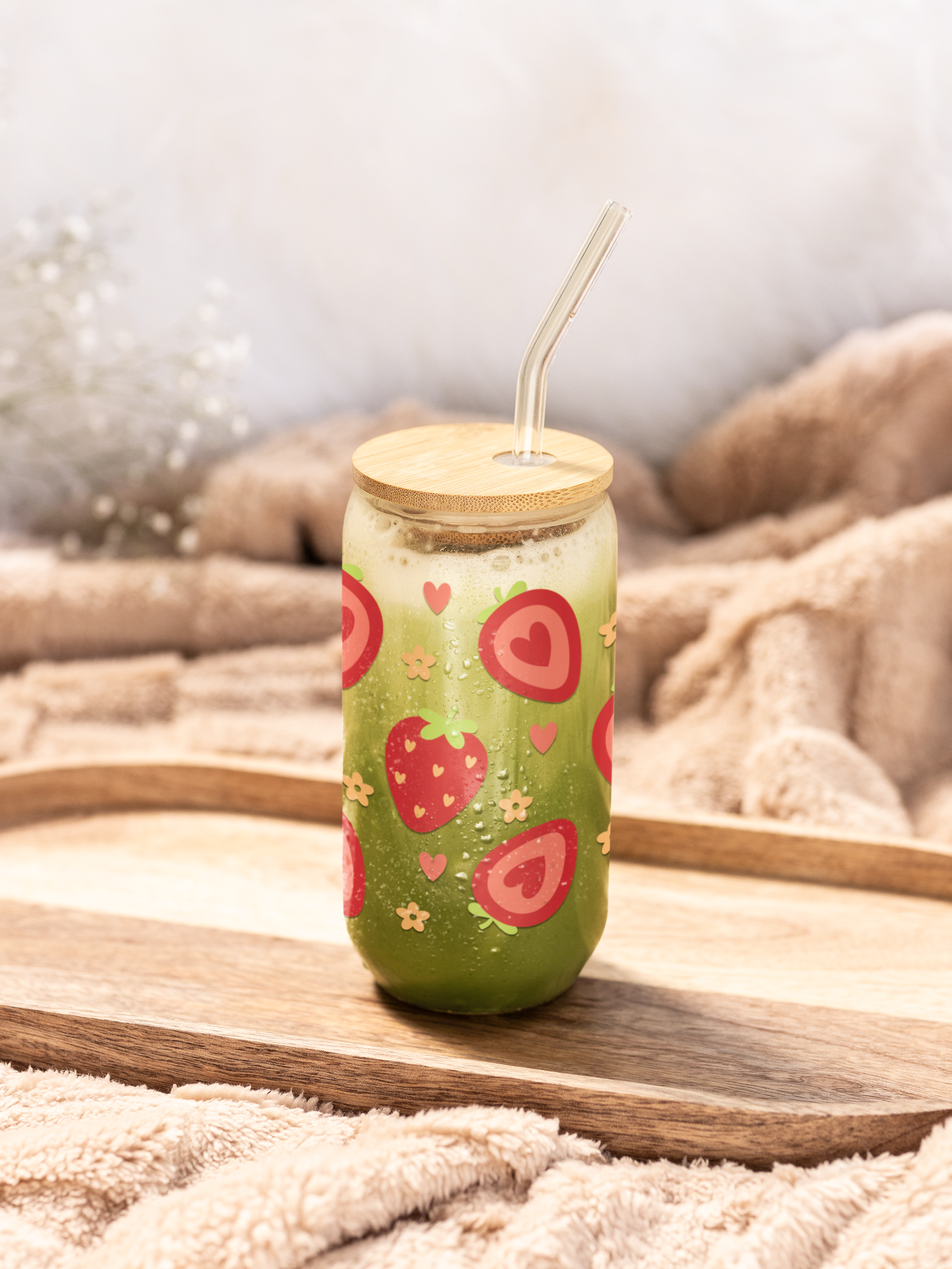This 16 oz glass can is bursting with love and strawberries! Featuring a playful design of bright red strawberries and strawberry slices filled with heart details, this cup is perfect for iced matcha, agua fresca, or your fave refresher. Comes complete with a bamboo lid and curved glass straw.
