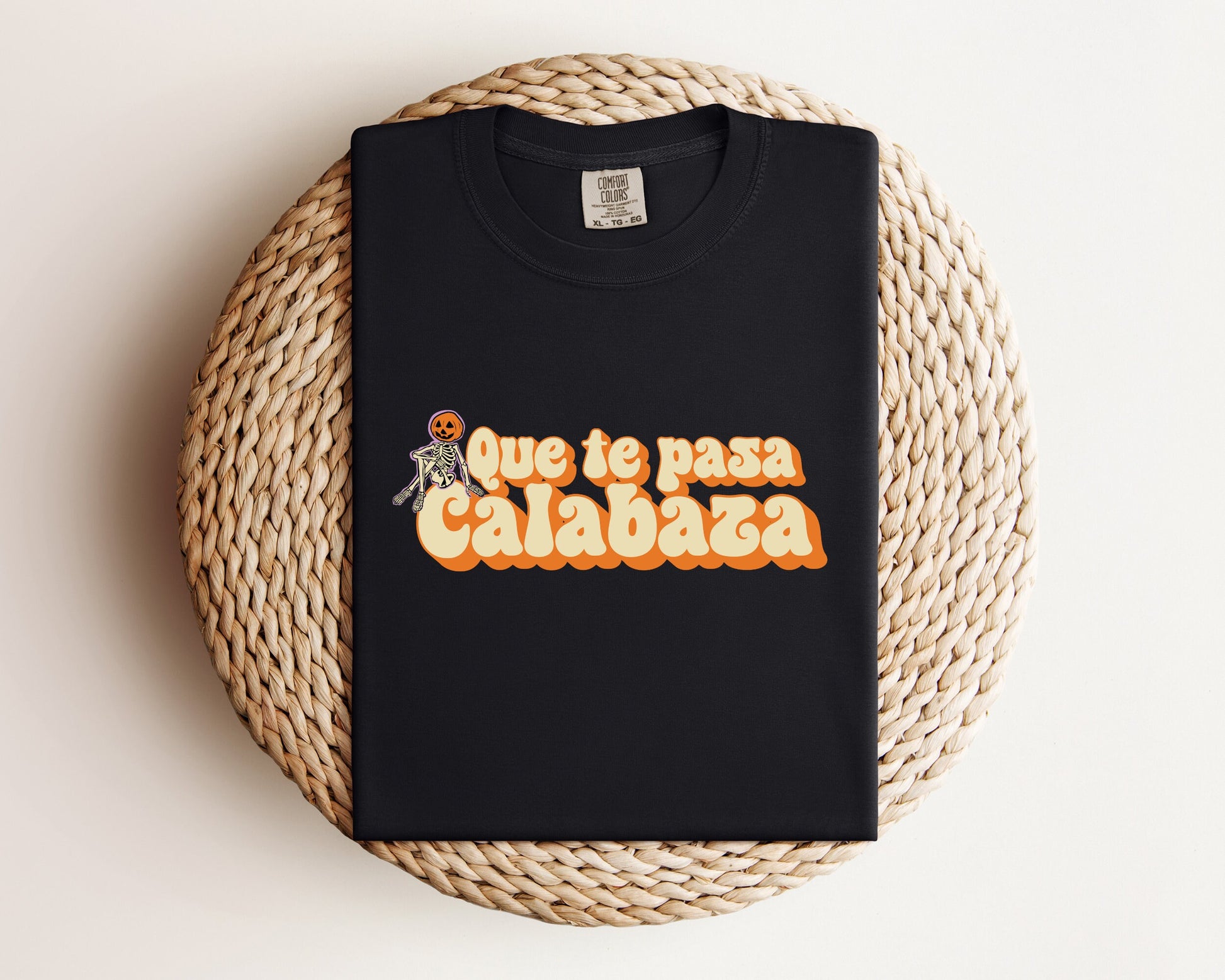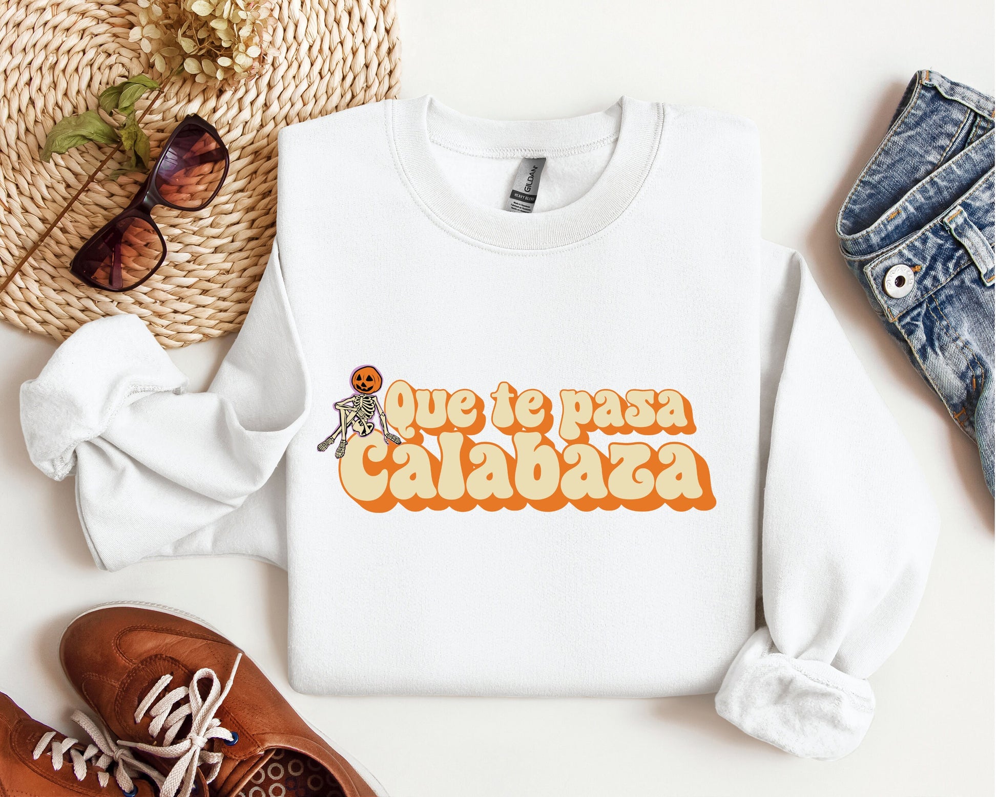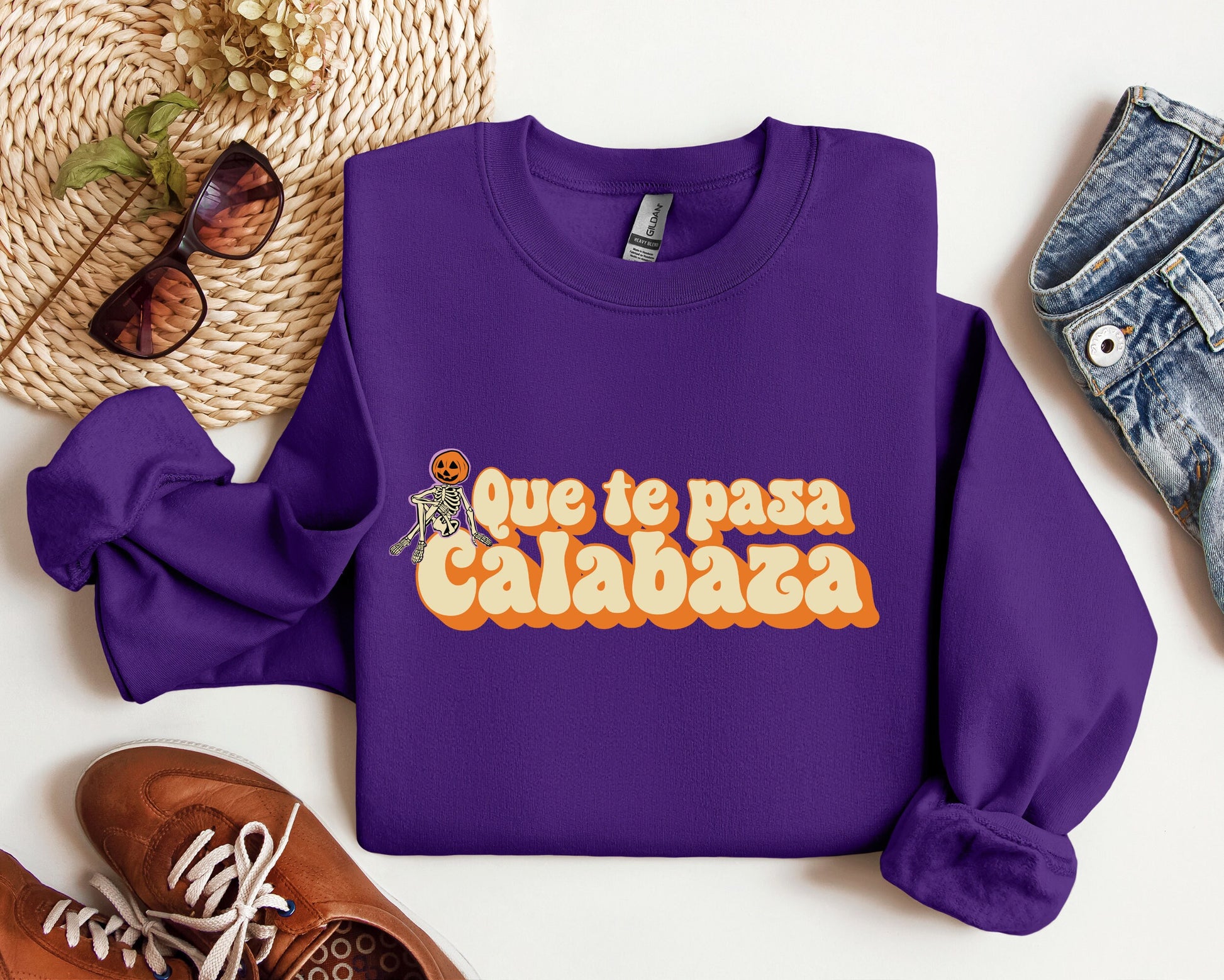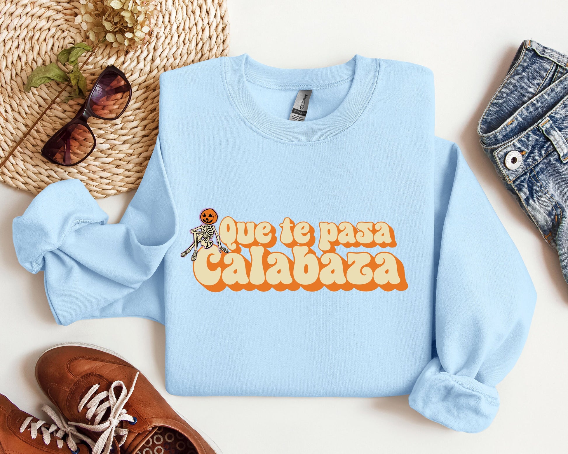 Embrace your heritage, celebrate Halloween, and stand out with style. Get your "Que te Pasa Calabaza" sweater today!