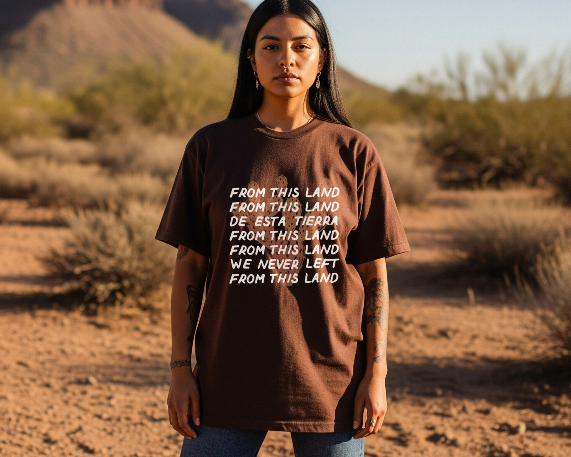 Printed on a soft, earth-toned tee with bold lettering, this piece is more than a shirt — it’s a statement.